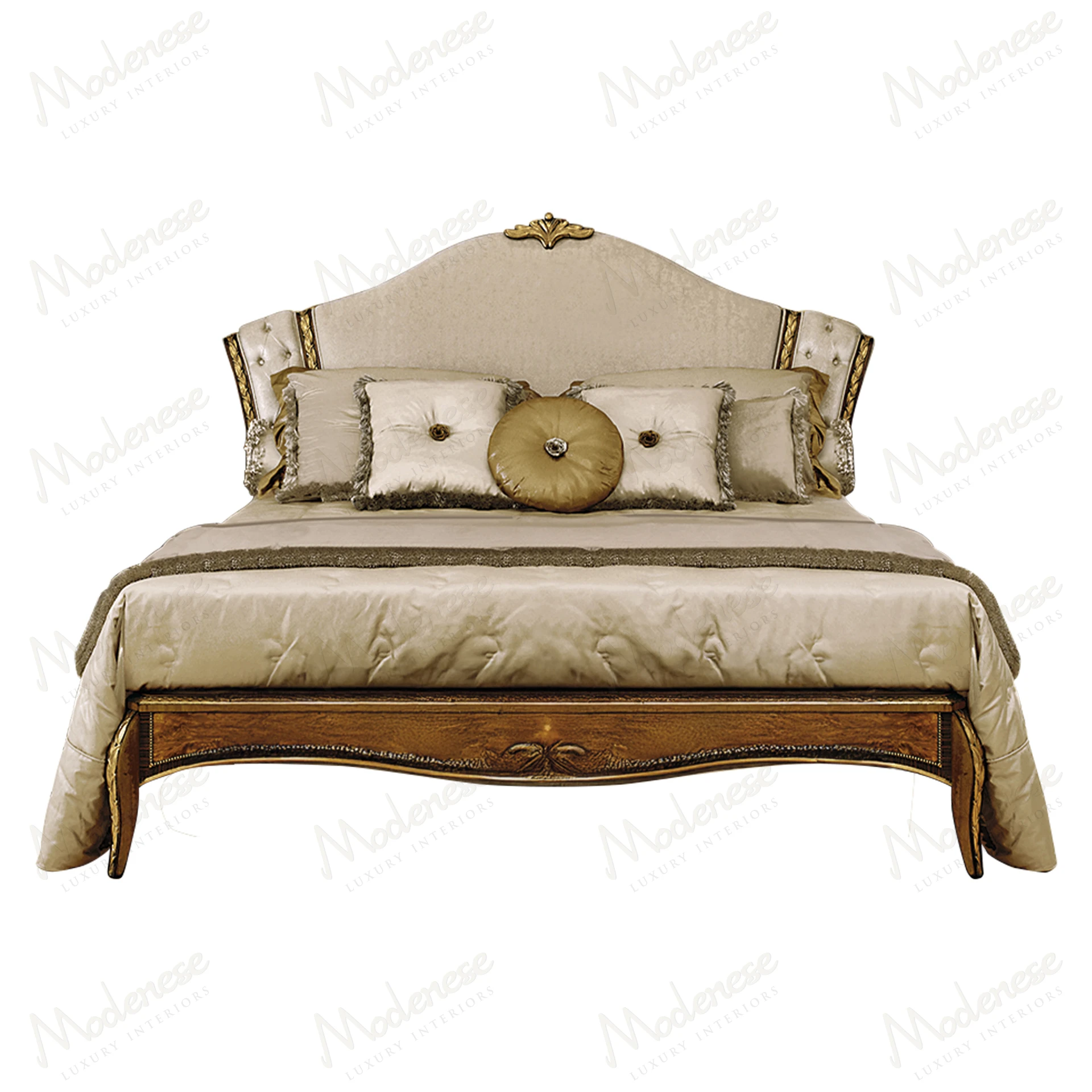 •  A grand bedroom that radiates opulence and classical elegance. A large, luxurious bed with a high, ornate headboard and footboard finished in dark wood with gold detailing is positioned centrally.