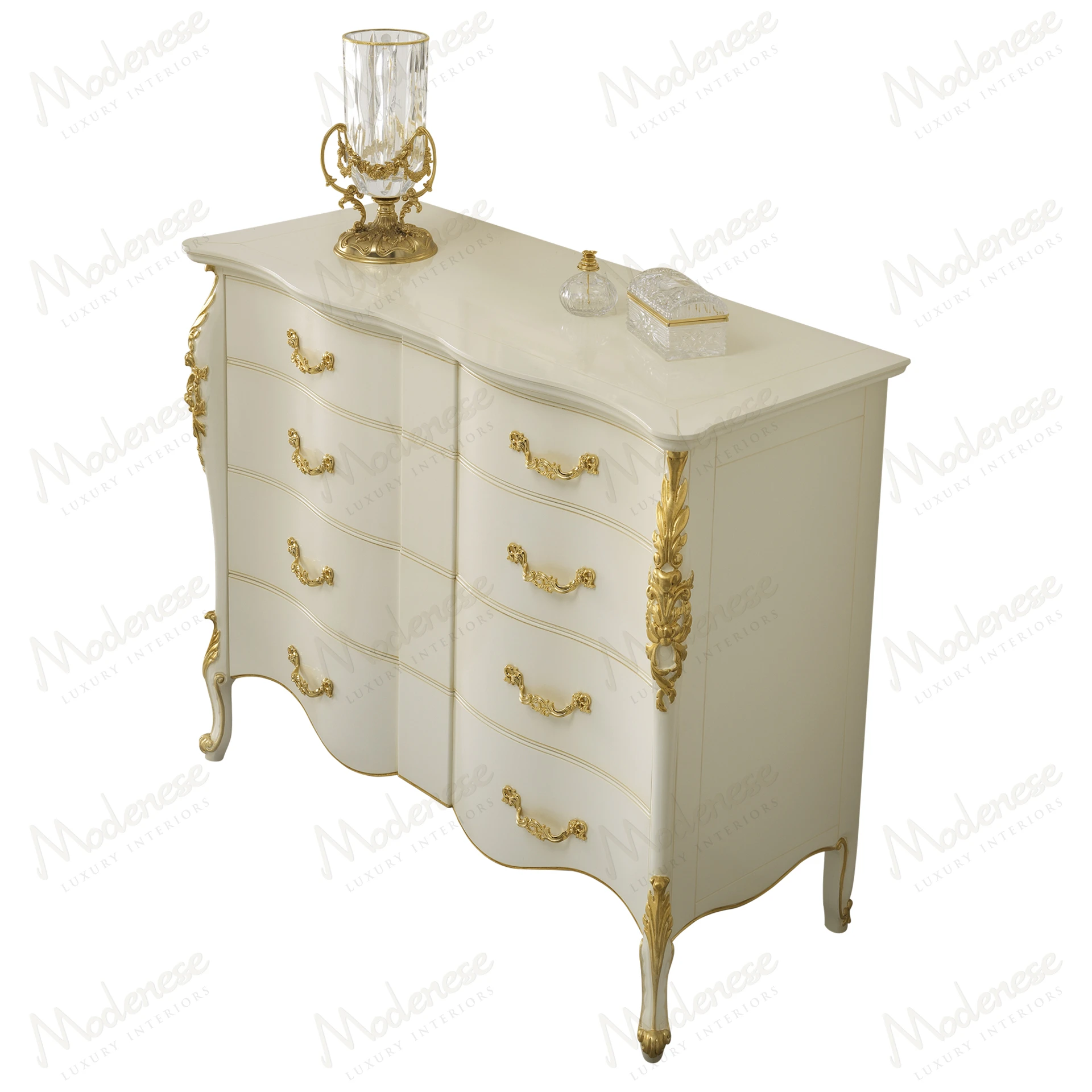 Commode baroque sur mesure de Modenese Gastone Interiors, producteur de meubles italien. L'élégance unique de cette commode à cinq tiroirs est remarquable avec sa silhouette bombée, la finition laquée blanc froid et les décorations en feuille d'argent. Spécialisé dans la production sur mesure, Modenese Interiors peut étudier l'ensemble de votre projet de décoration intérieure et créer des meubles assortis. Par exemple, cet article peut être personnalisé pour s'harmoniser avec le lit, le miroir, l'armoire et la table de nuit. Les versions alternatives peuvent inclure des décorations florales et des tiroirs doublés.