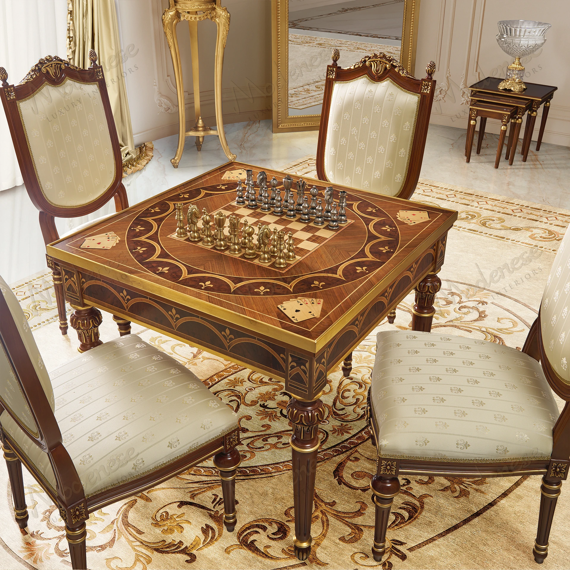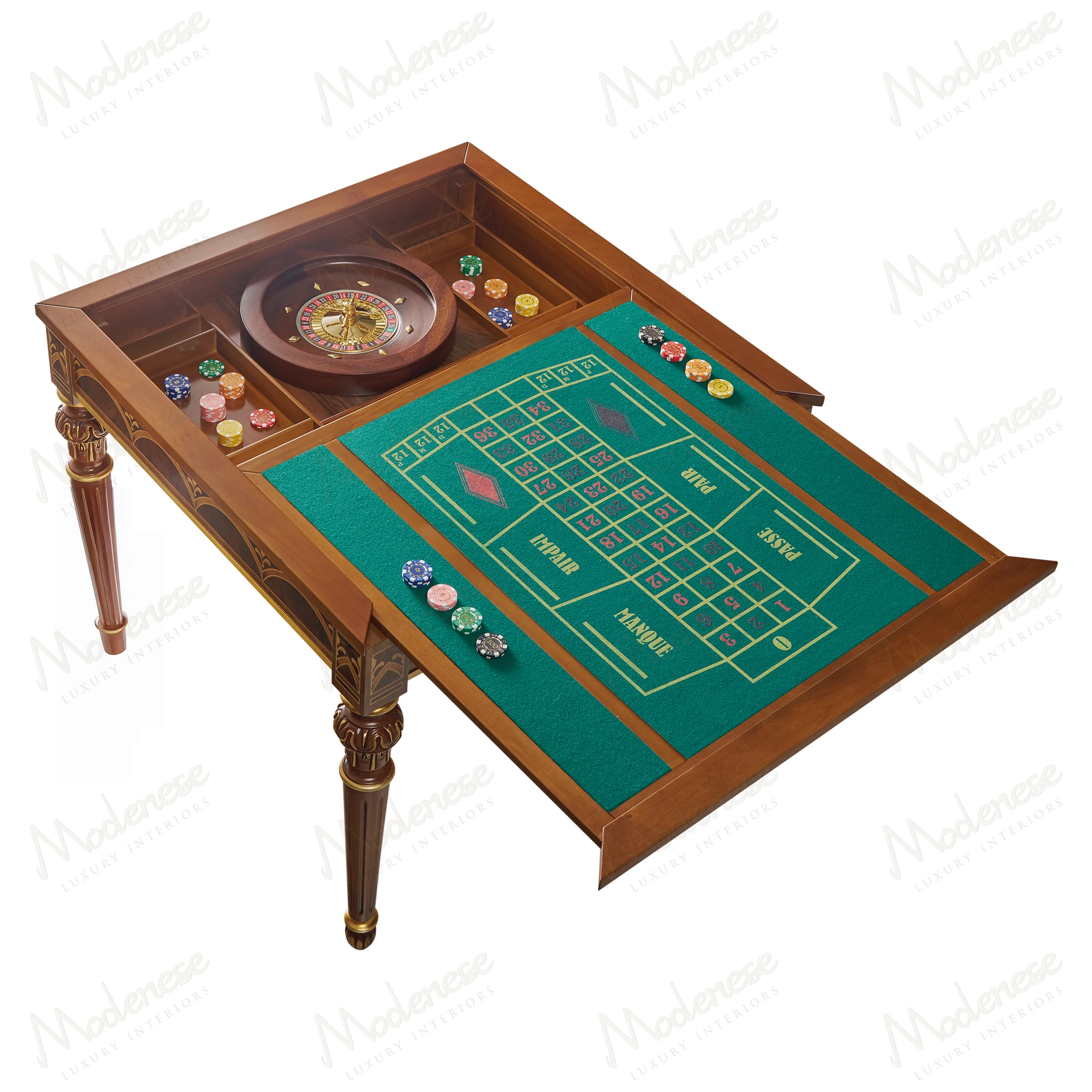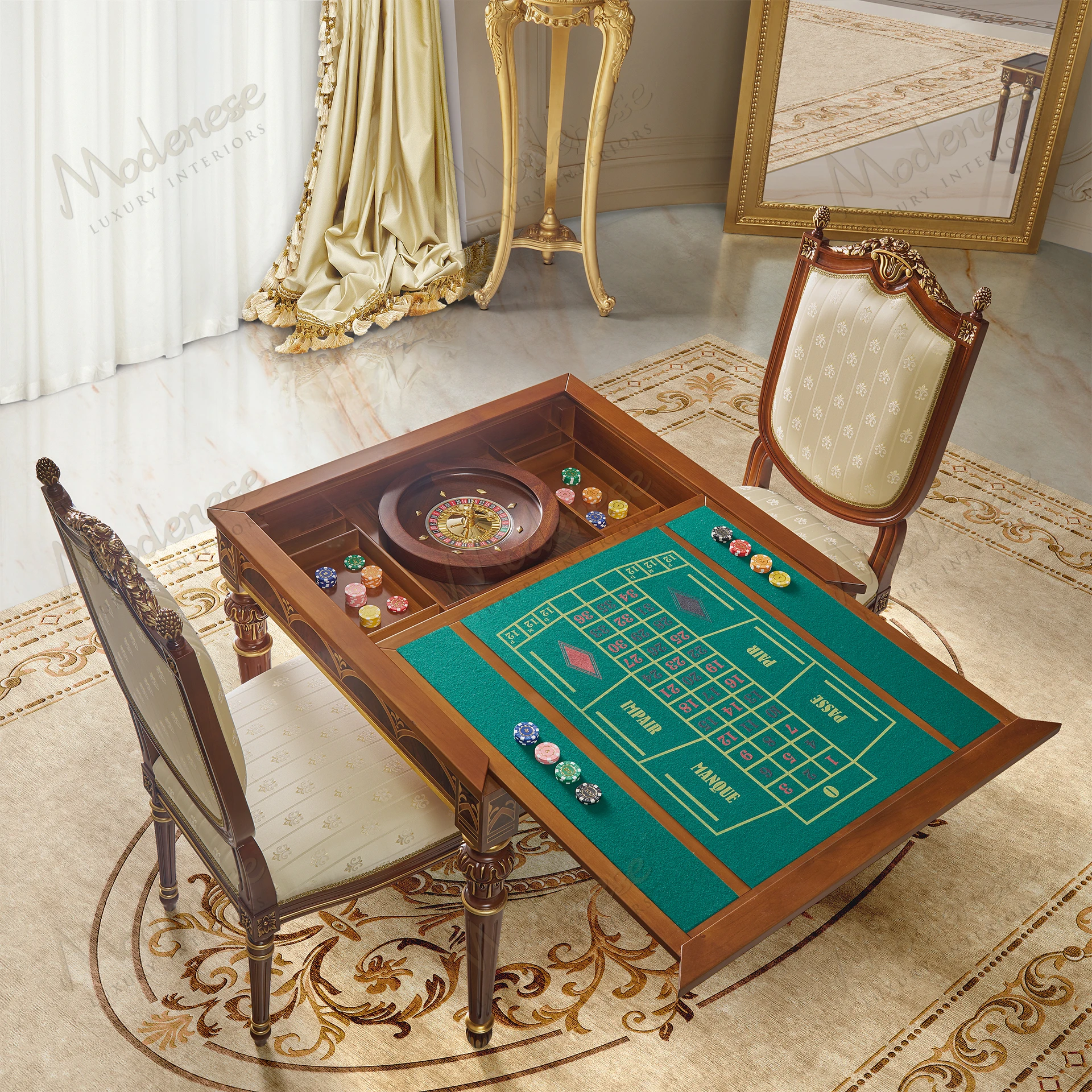 The Elite Gaming Table by Modenese Luxury Furniture is a refined celebration of leisure and elegance. Crafted with exquisite inlais and fine finishes, this multifunctional masterpiece transforms effortlessly from a luxurious chess and card table into a fully equipped roulette and casino gaming station. Ideal for exclusive entertainment rooms, it perfectly merges traditional craftsmanship with playful sophistication.