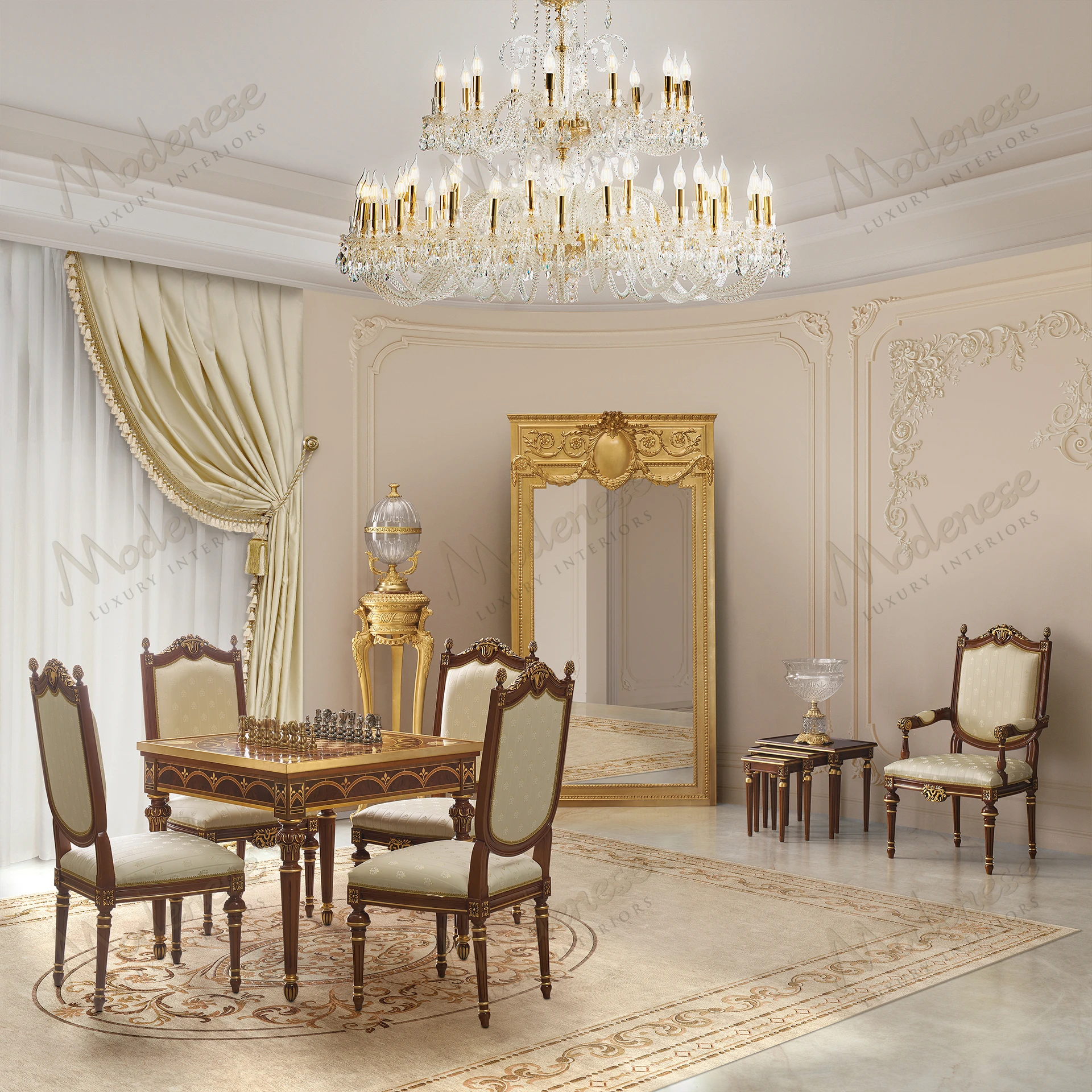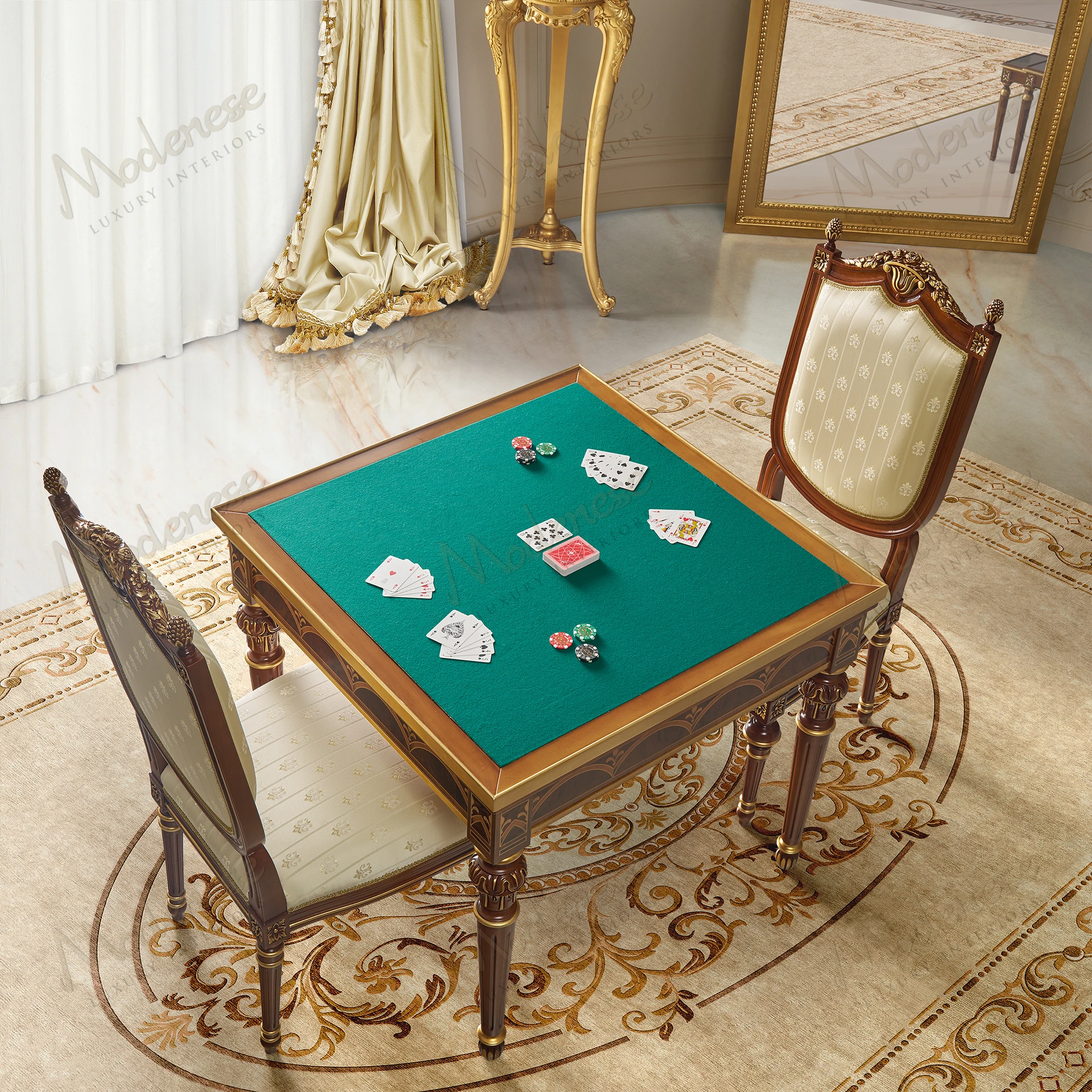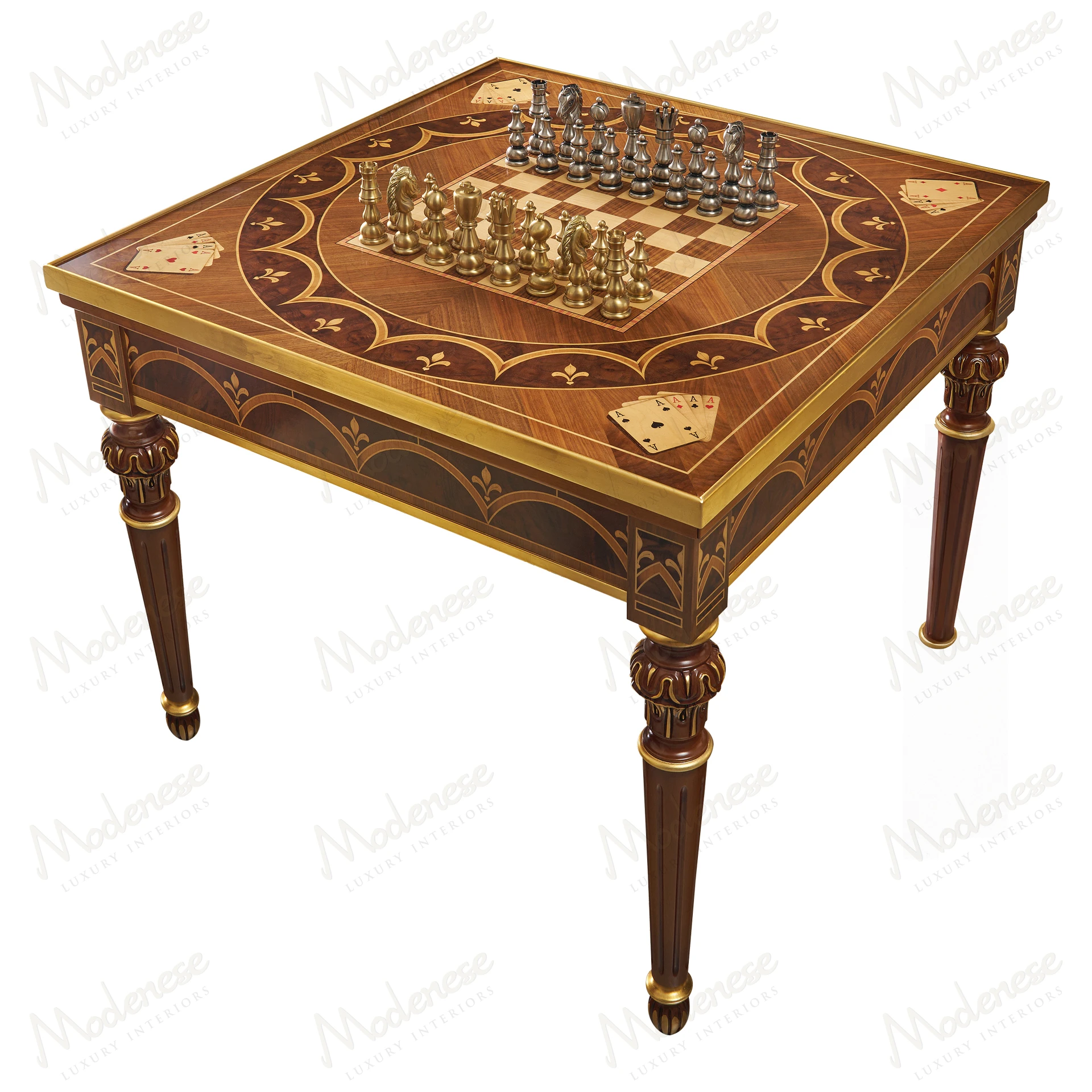 The Elite Gaming Table by Modenese Luxury Furniture is a refined celebration of leisure and elegance. Crafted with exquisite inlais and fine finishes, this multifunctional masterpiece transforms effortlessly from a luxurious chess and card table into a fully equipped roulette and casino gaming station. Ideal for exclusive entertainment rooms, it perfectly merges traditional craftsmanship with playful sophistication.