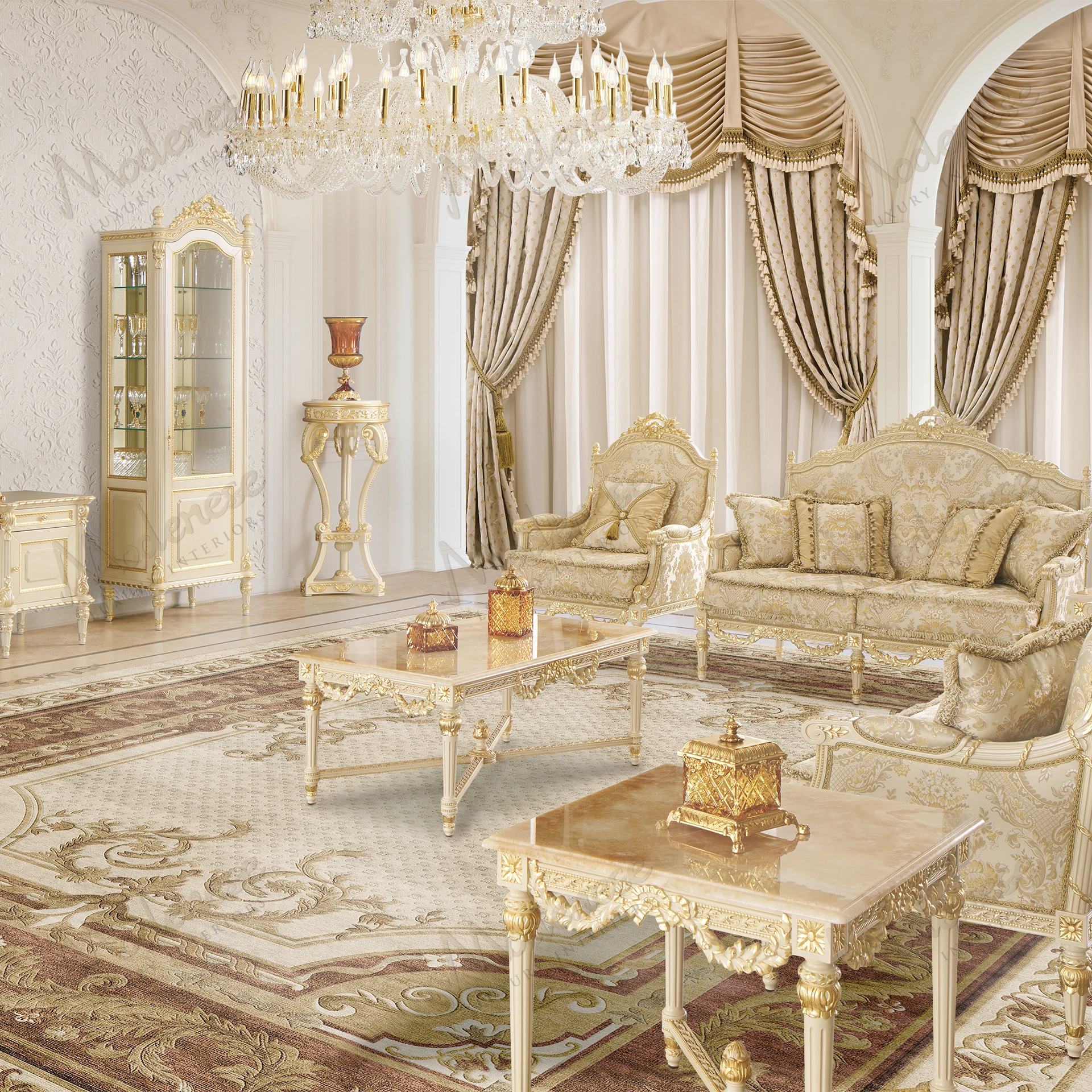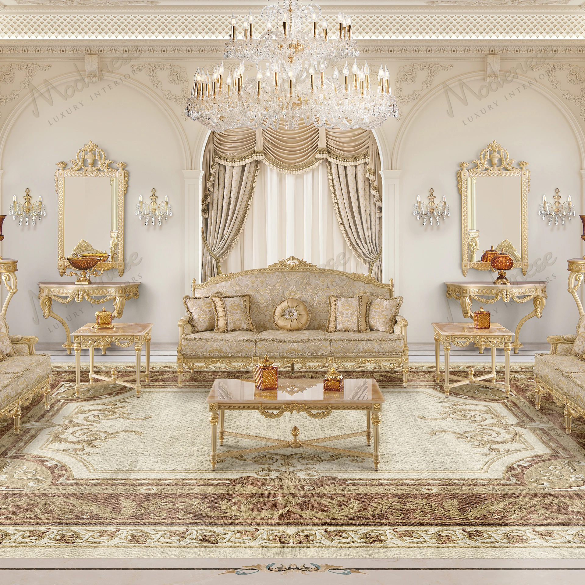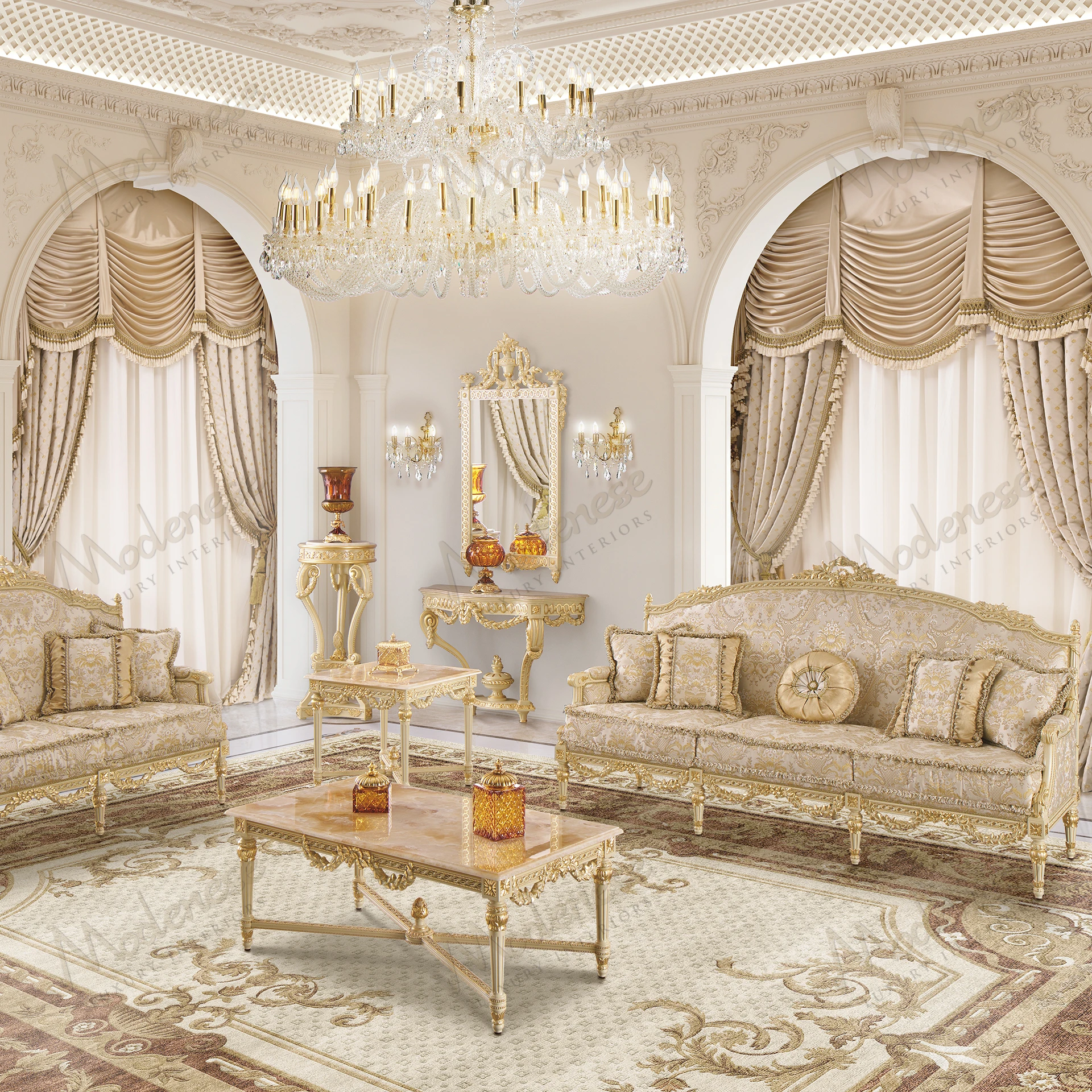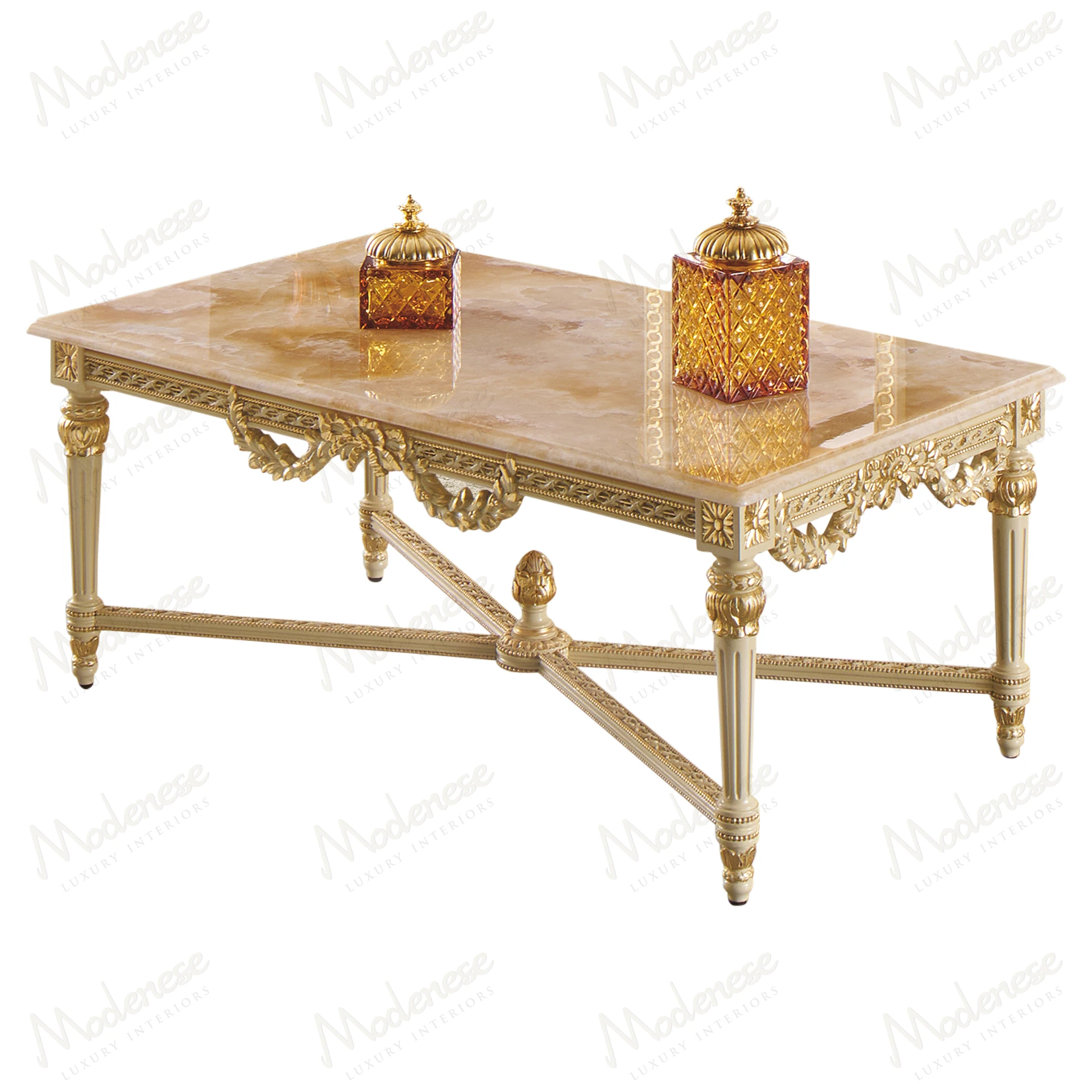 The Imperial Majesty Coffee Table is a true embodiment of regal refinement and masterful craftsmanship. Designed to elevate any luxurious living space, this table features an exquisite Honey Onyx top, reflecting sophistication and grace. The finely carved gold-leaf decorated wooden base is adorned with intricate classical motifs, adding a touch of aristocratic grandeur. Its delicate yet sturdy structure makes it a perfect statement piece for those who seek timeless elegance in their interiors.