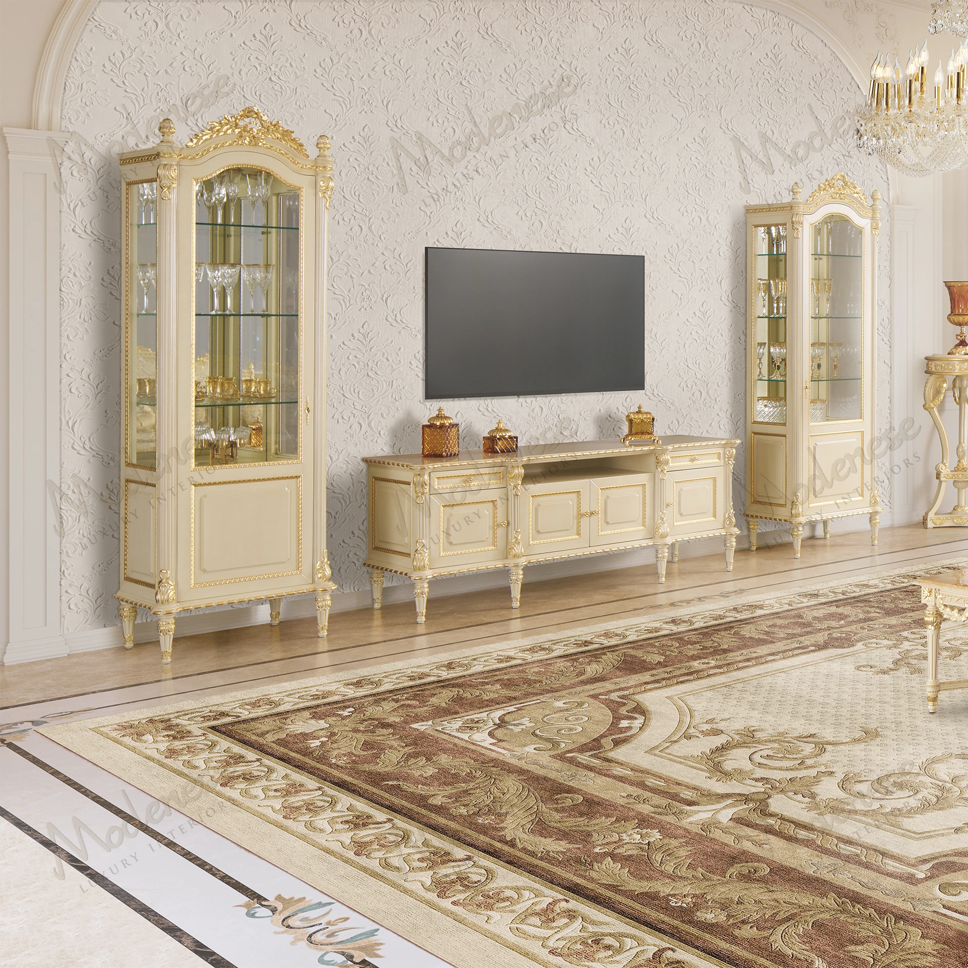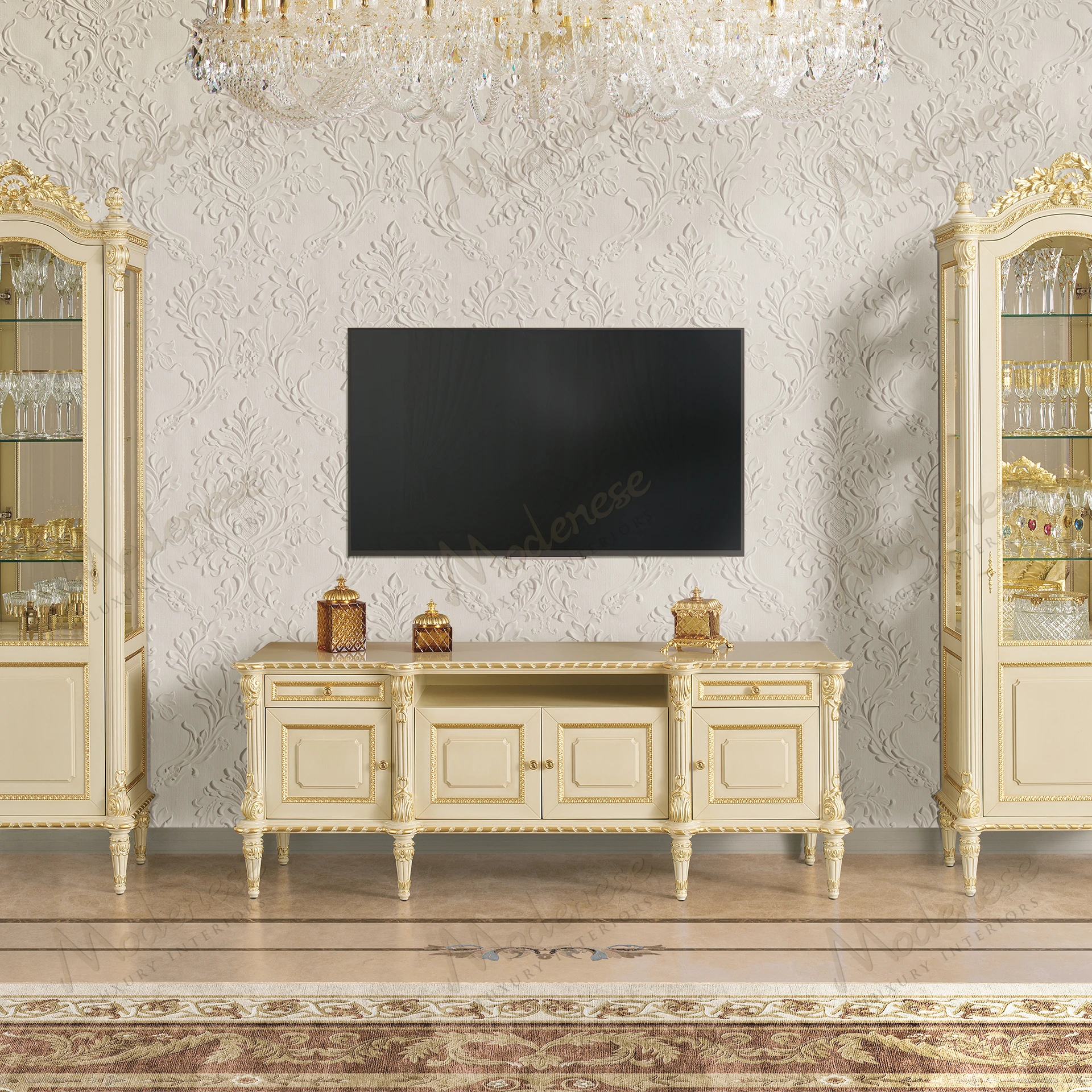 Le meuble TV Imperial Majesty est un symbole de luxe intemporel et de sophistication royale. Méticuleusement fabriqué à la main, cette pièce magnifique met en valeur des détails dorés complexes sur une finition ivoire raffinée, dégageant de l'élégance dans les moindres détails. Son design symétrique, orné de colonnes cannelées et d'ornements sculptés à la main, en fait une véritable déclaration d'art classique. Doté de placards et de tiroirs spacieux, il offre à la fois fonctionnalité et grandeur, ce qui en fait la pièce maîtresse idéale pour un espace de vie opulent.