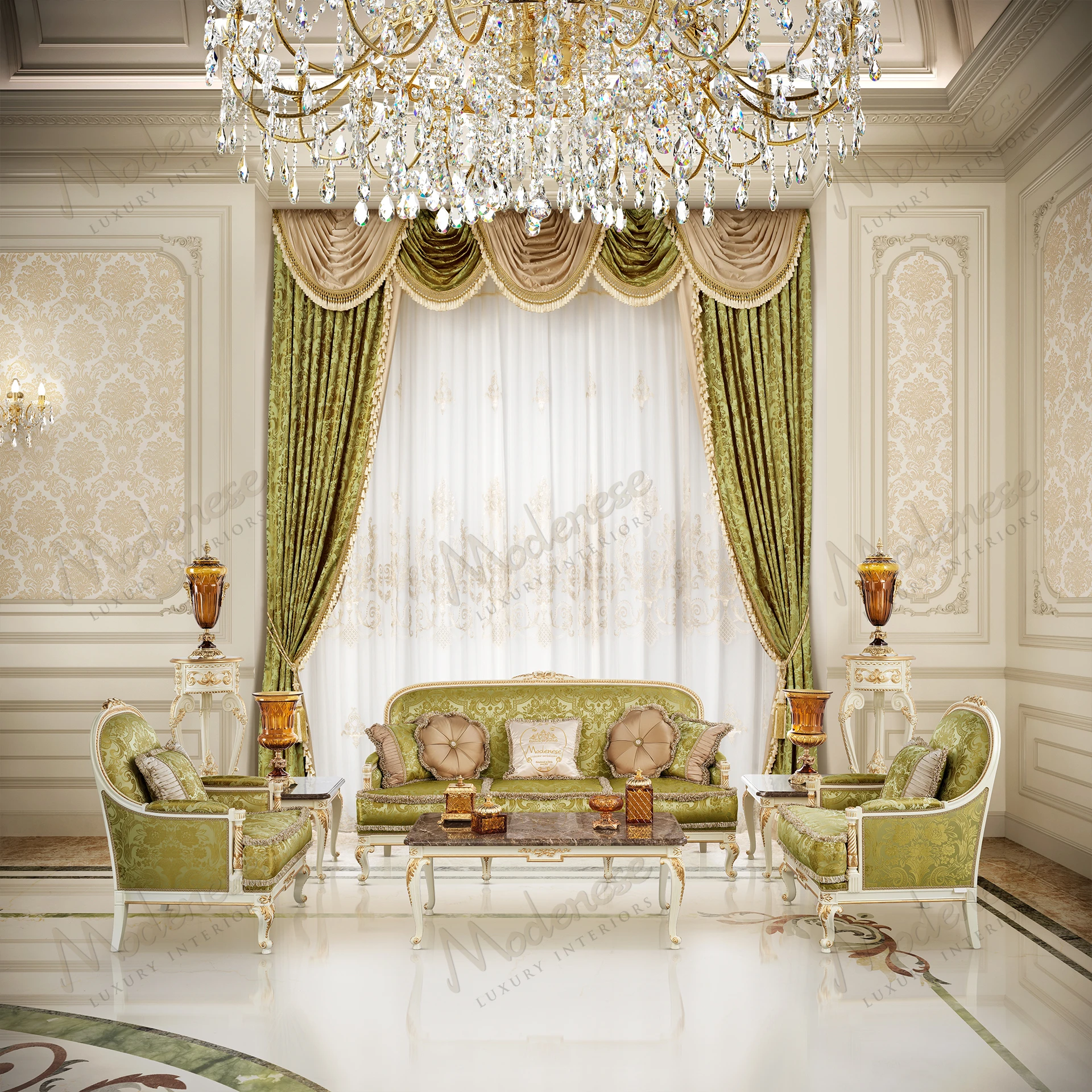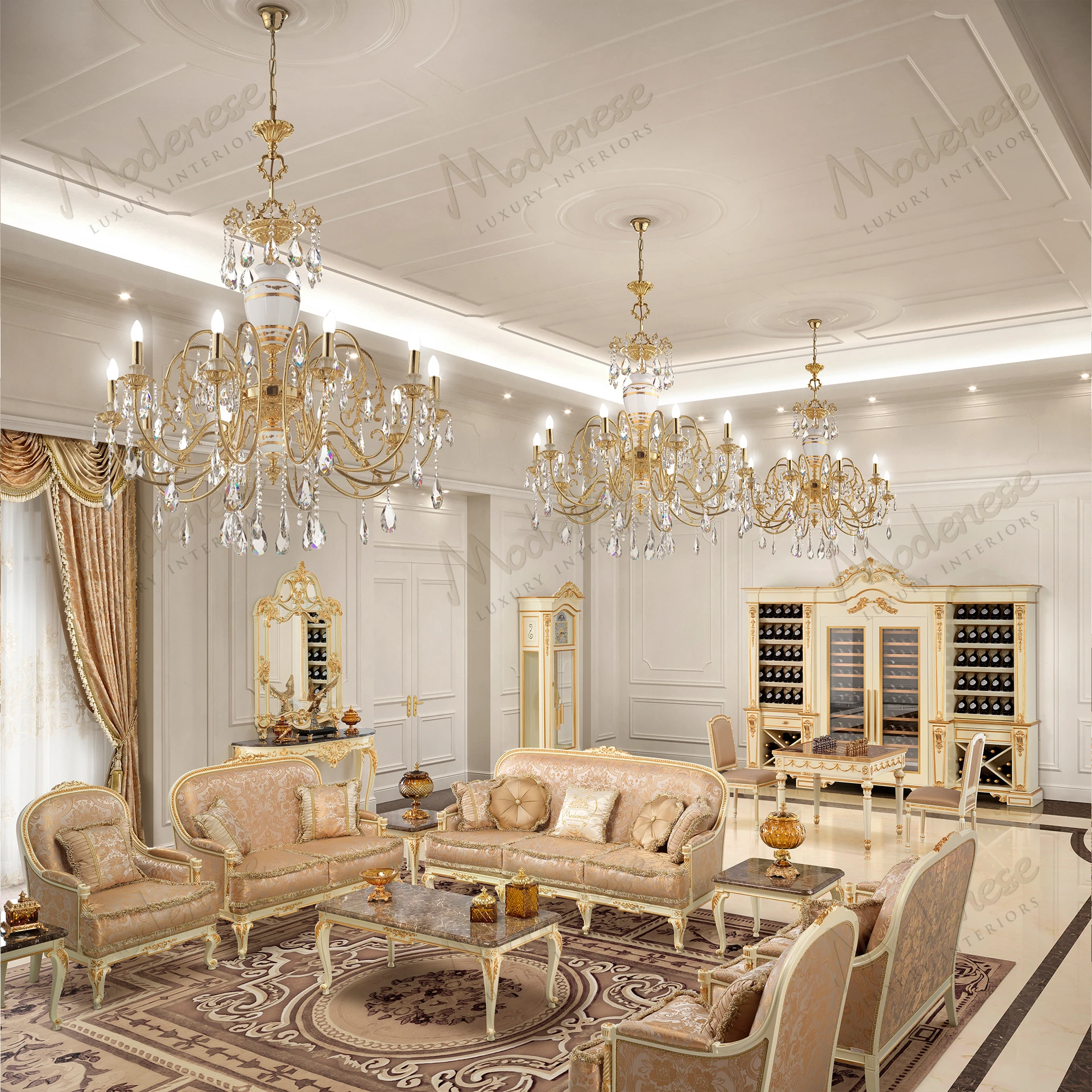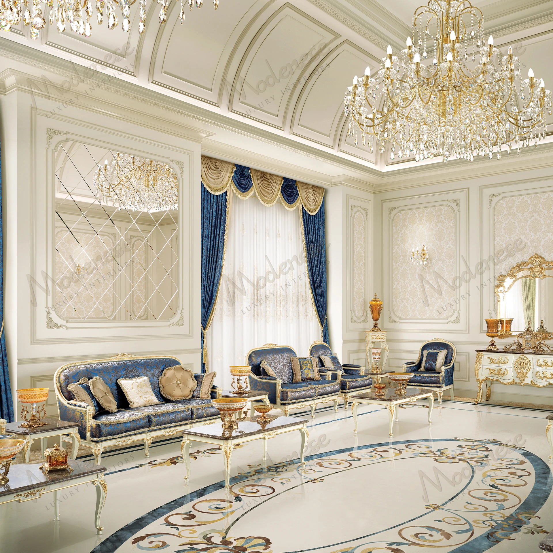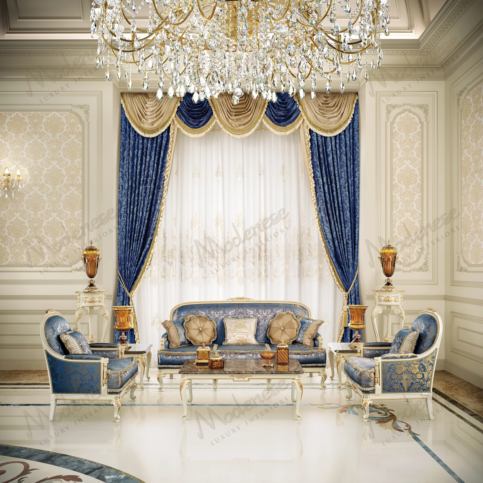The Midnight Moon 2-Seater Sofa is an exquisite embodiment of royal sophistication. Wrapped in a deep blue damask fabric with shimmering embroidery, this piece exudes a sense of timeless grandeur. Its elegantly curved silhouette, adorned with meticulously hand-carved and gilded details, enhances the regal charm of any living space. Plush cushions with refined trimmings provide an inviting seating experience, combining supreme comfort with an aristocratic aesthetic.