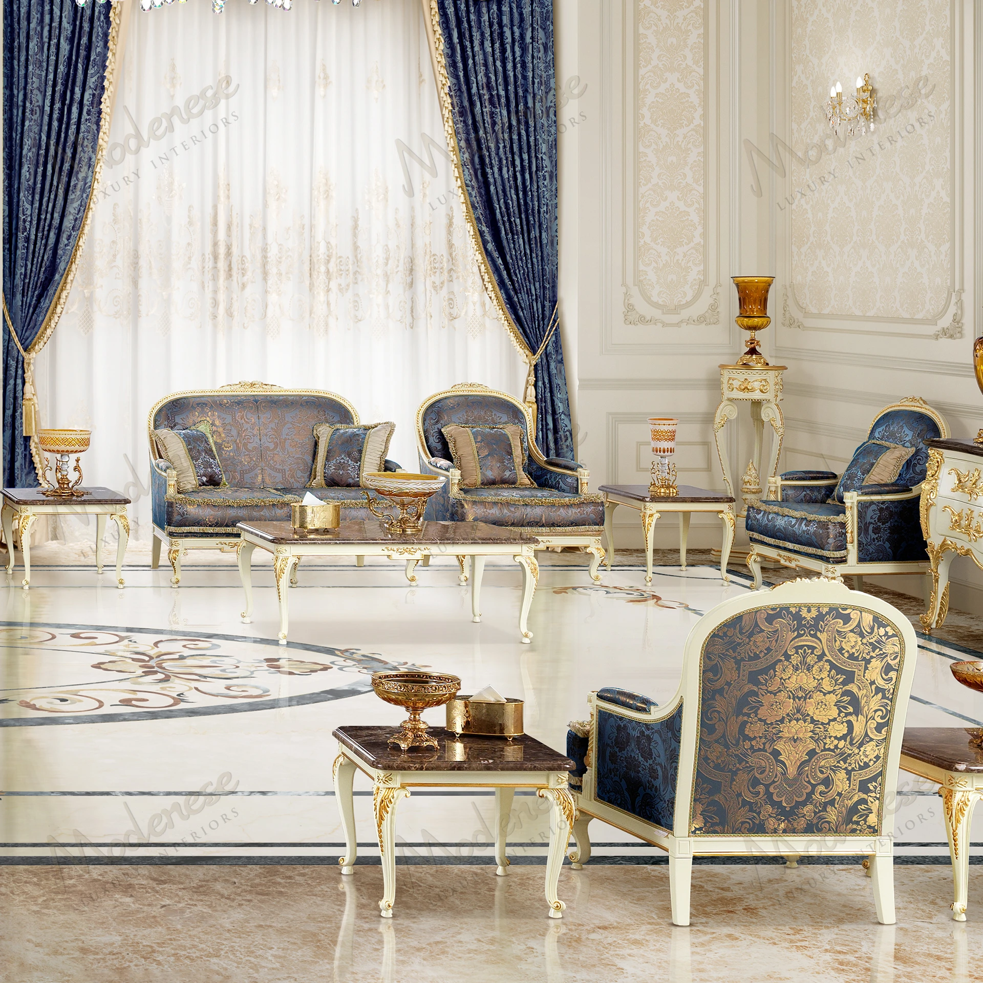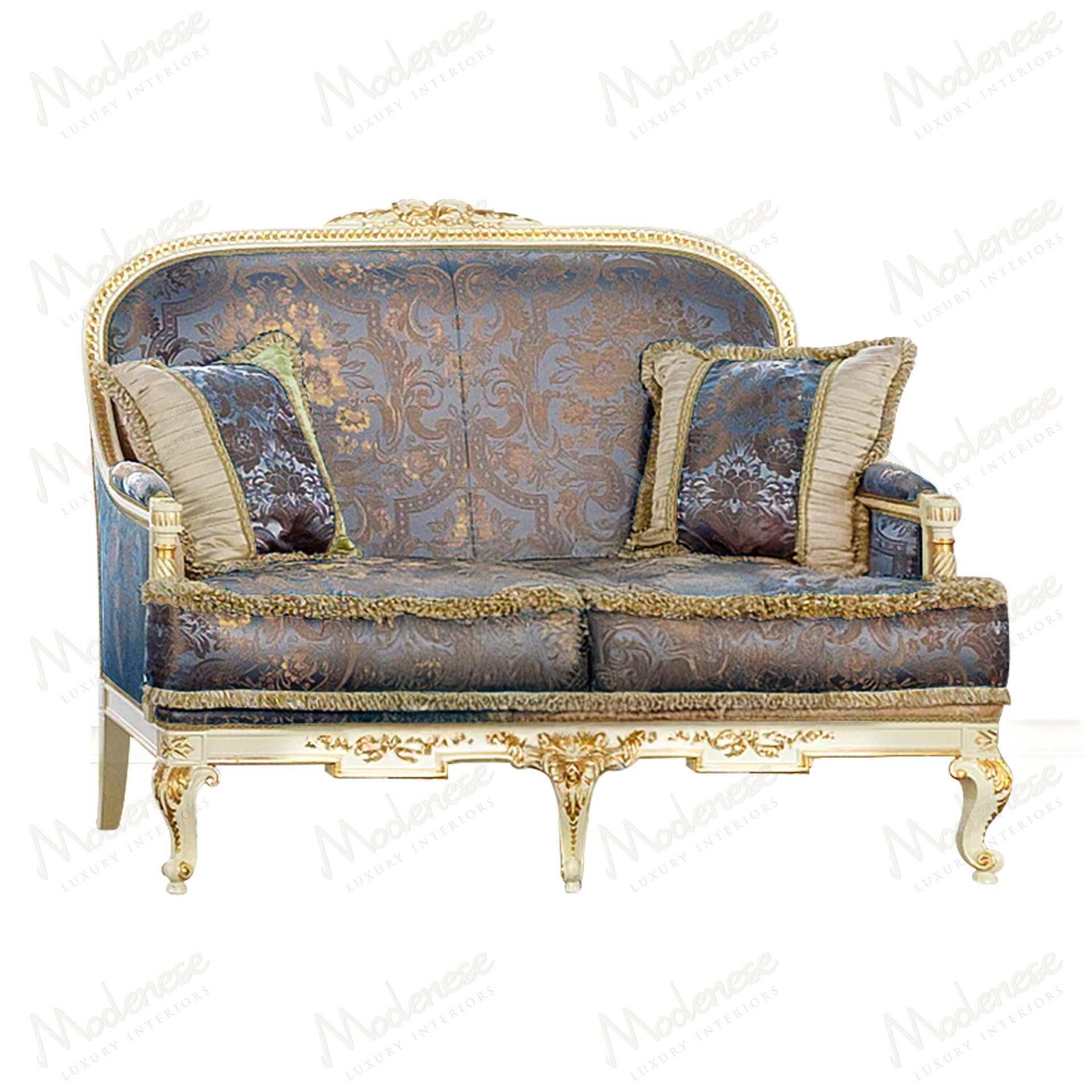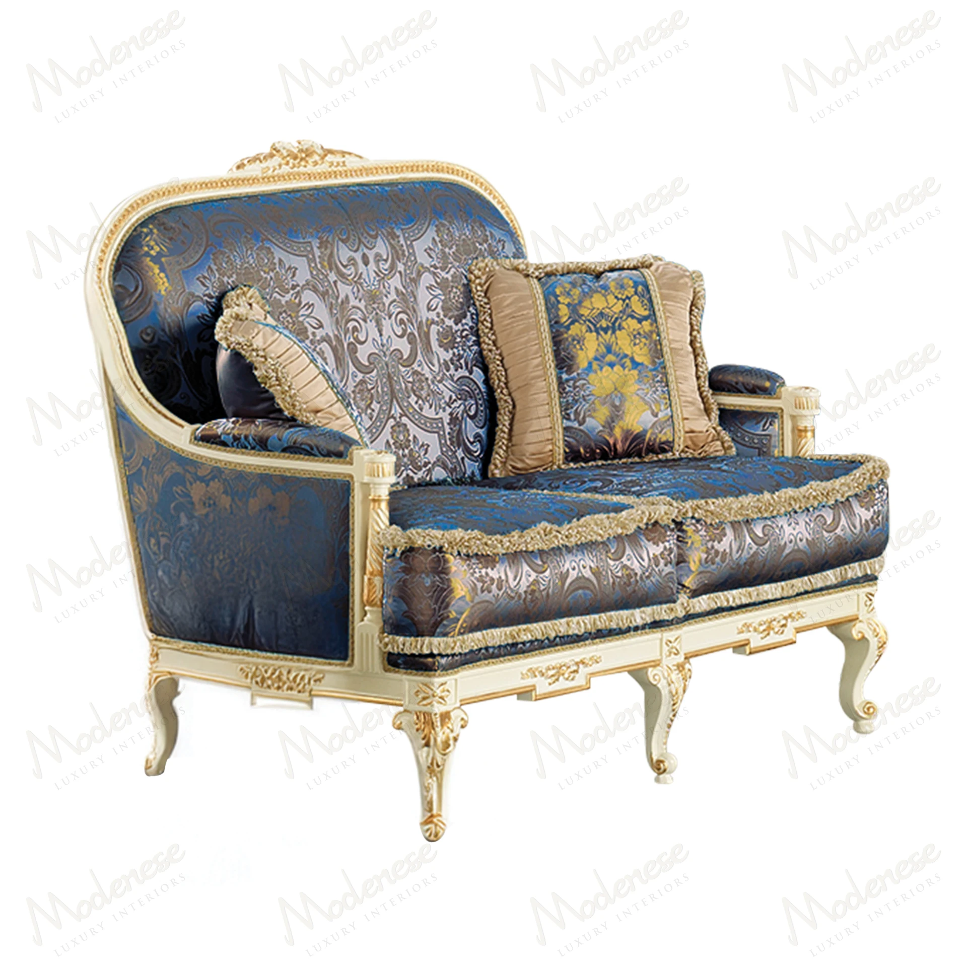 • Elegant Midnight Moon 2-seater sofa with white lacquered finish, gold leaf details, and blue-gold satin upholstery, exuding luxury and sophistication