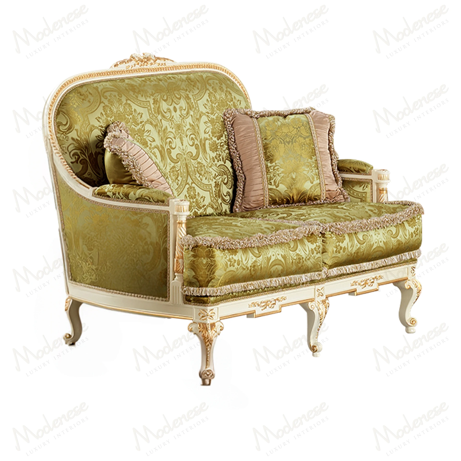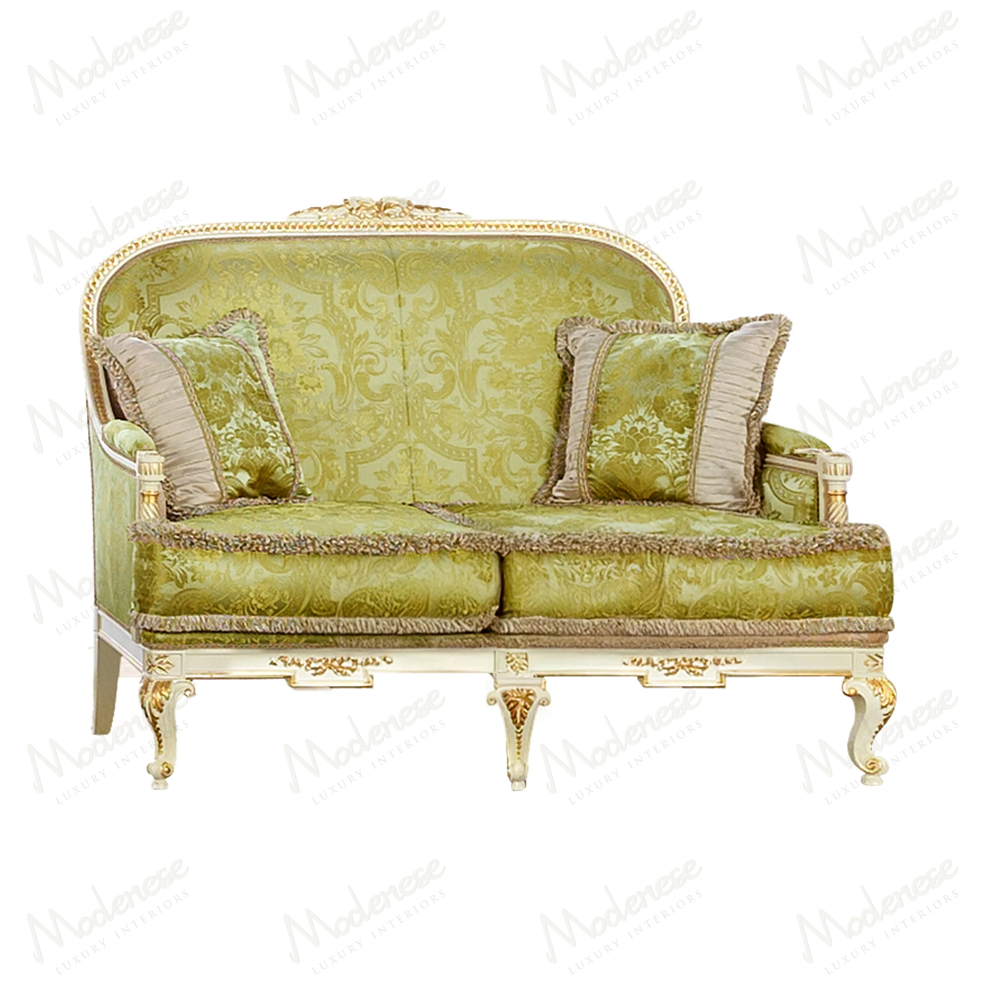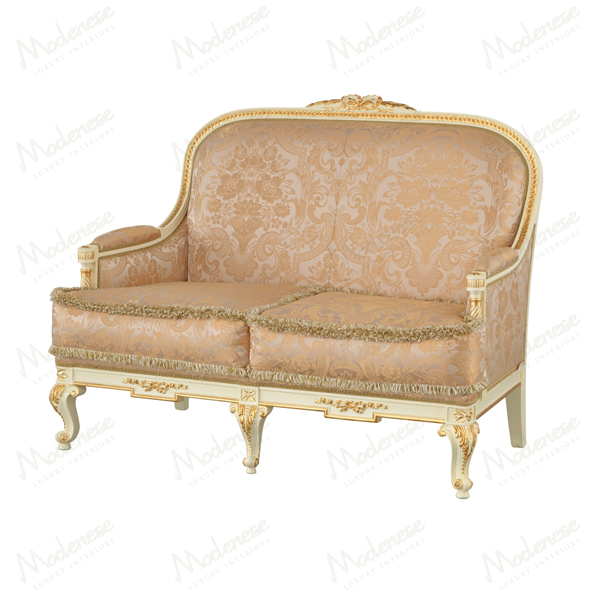 • Elegant Midnight Moon 2-seater sofa with white lacquered finish and gold leaf details, showcasing a sophisticated design