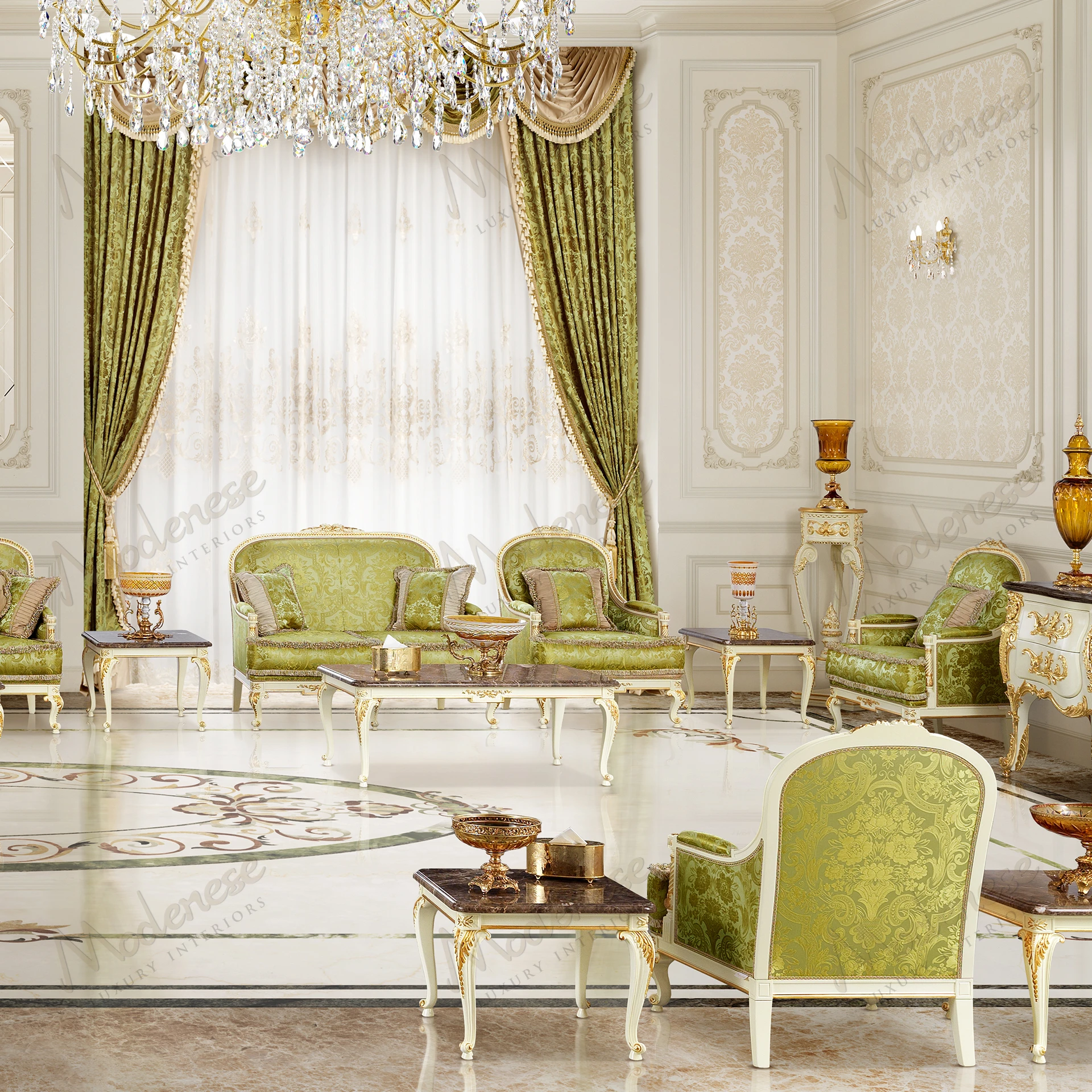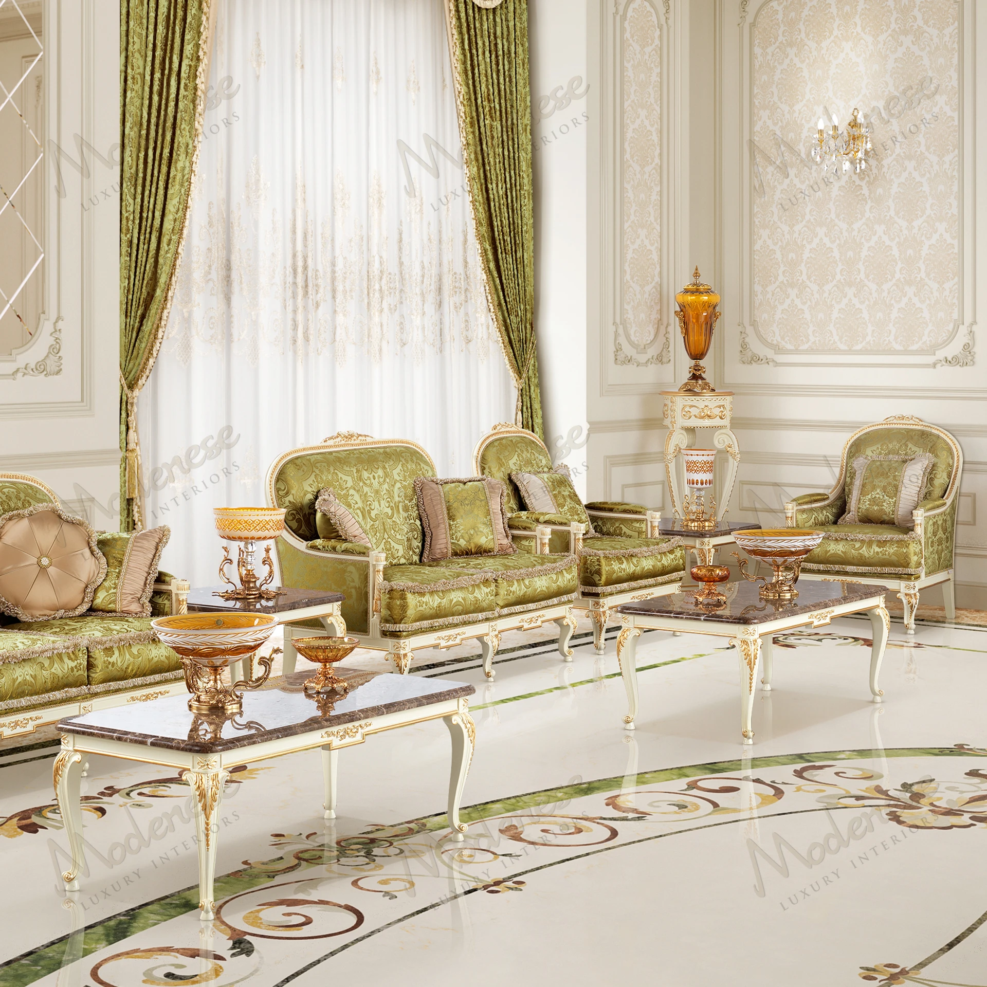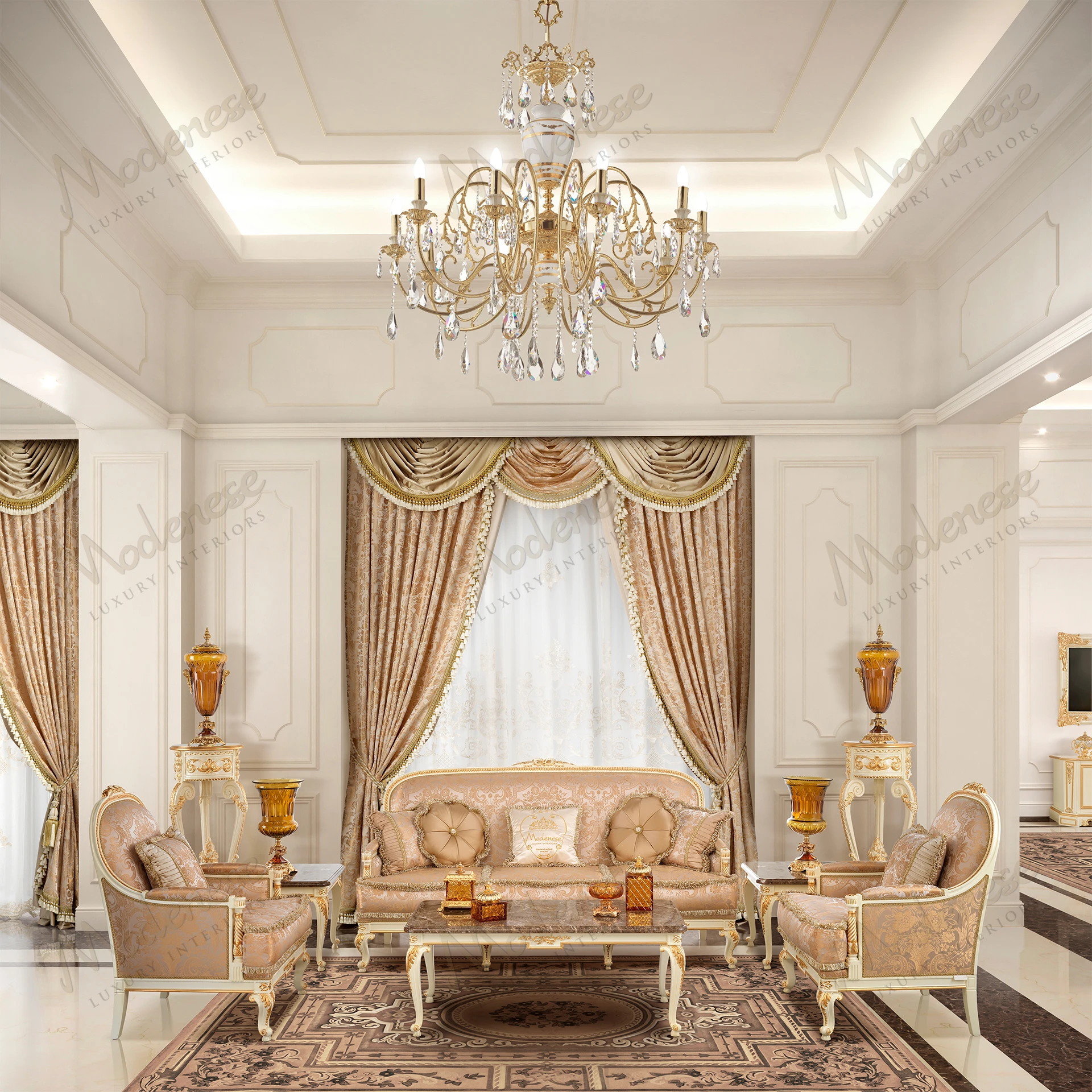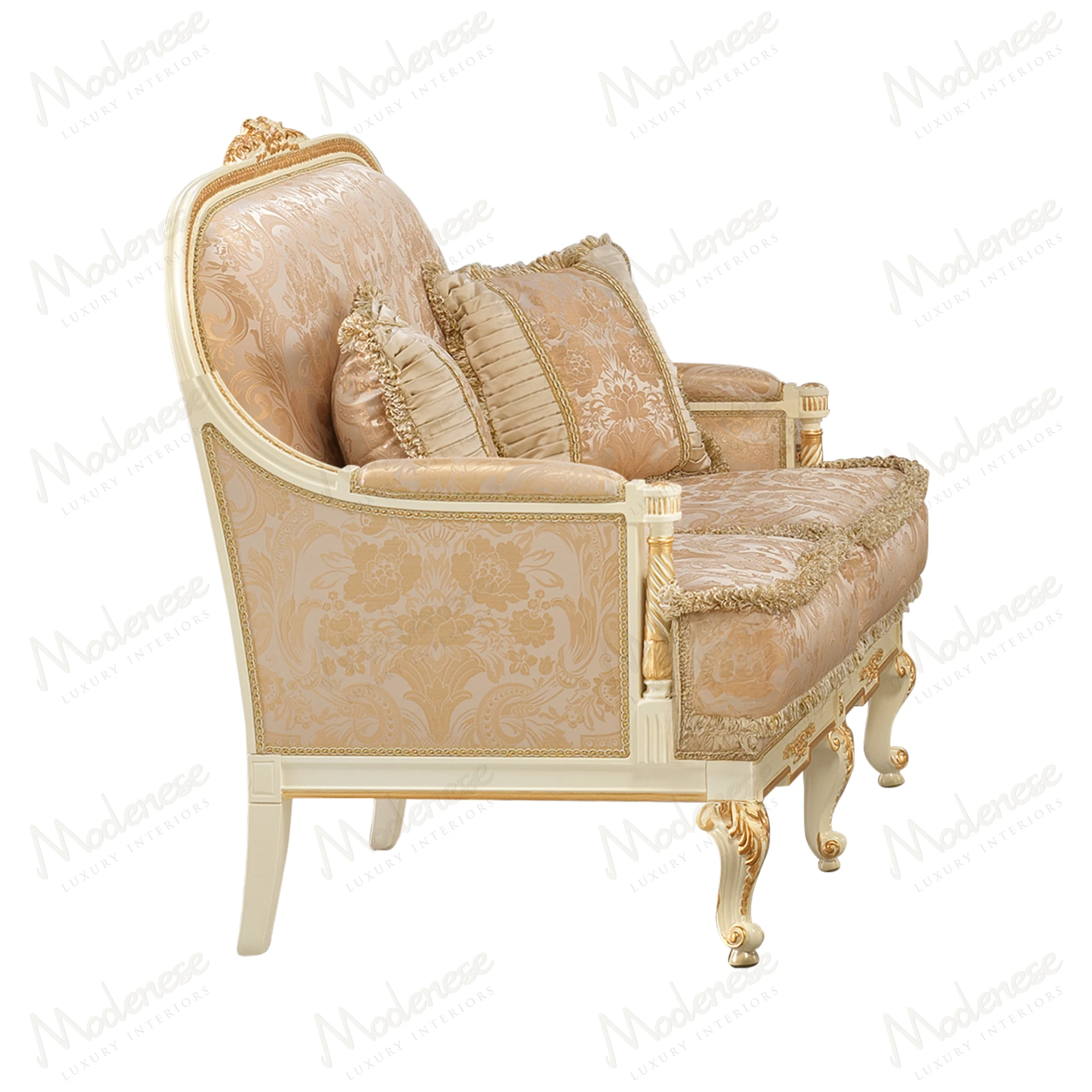 • Elegant Midnight Moon 2-seater sofa with white lacquered finish and gold leaf details, showcasing a sophisticated design