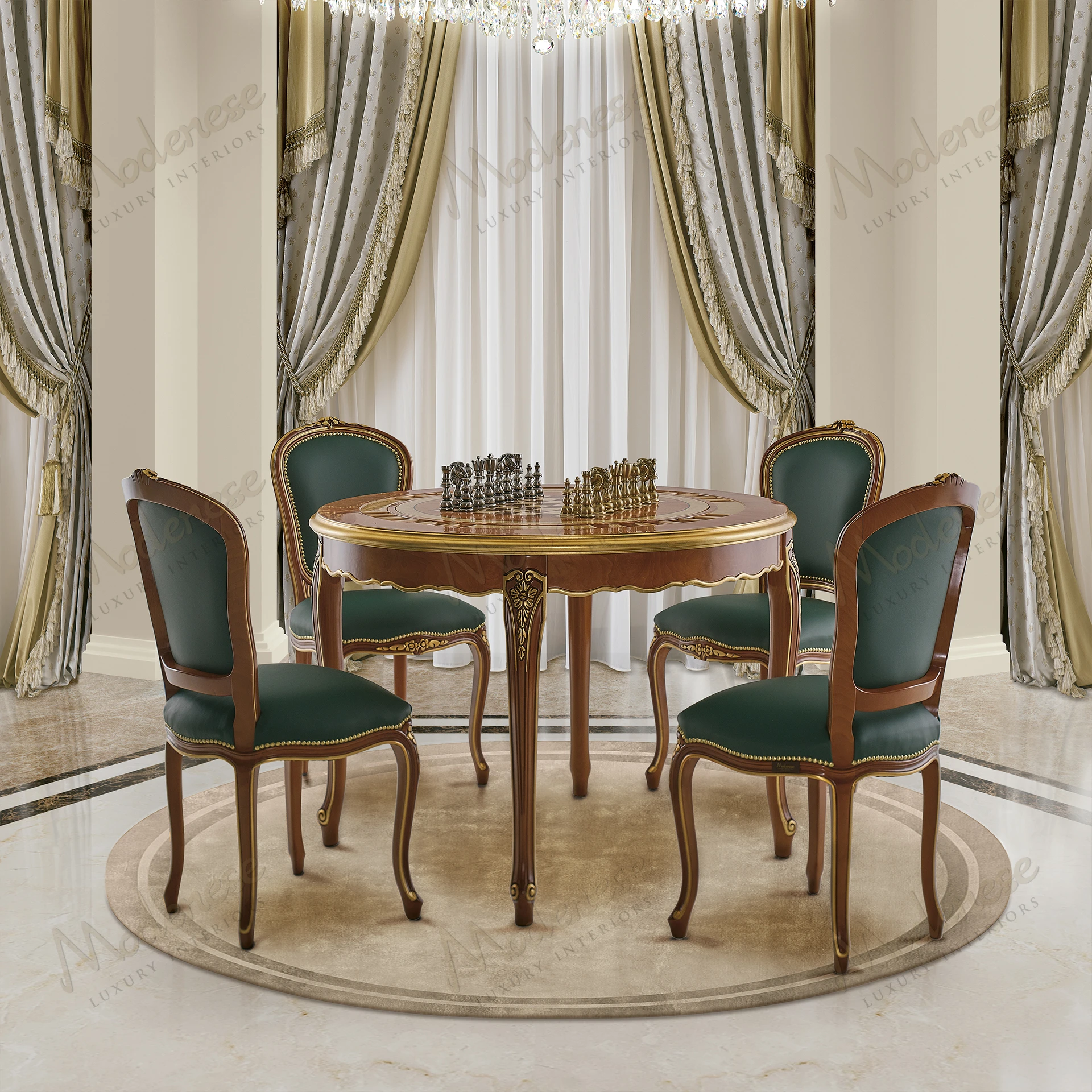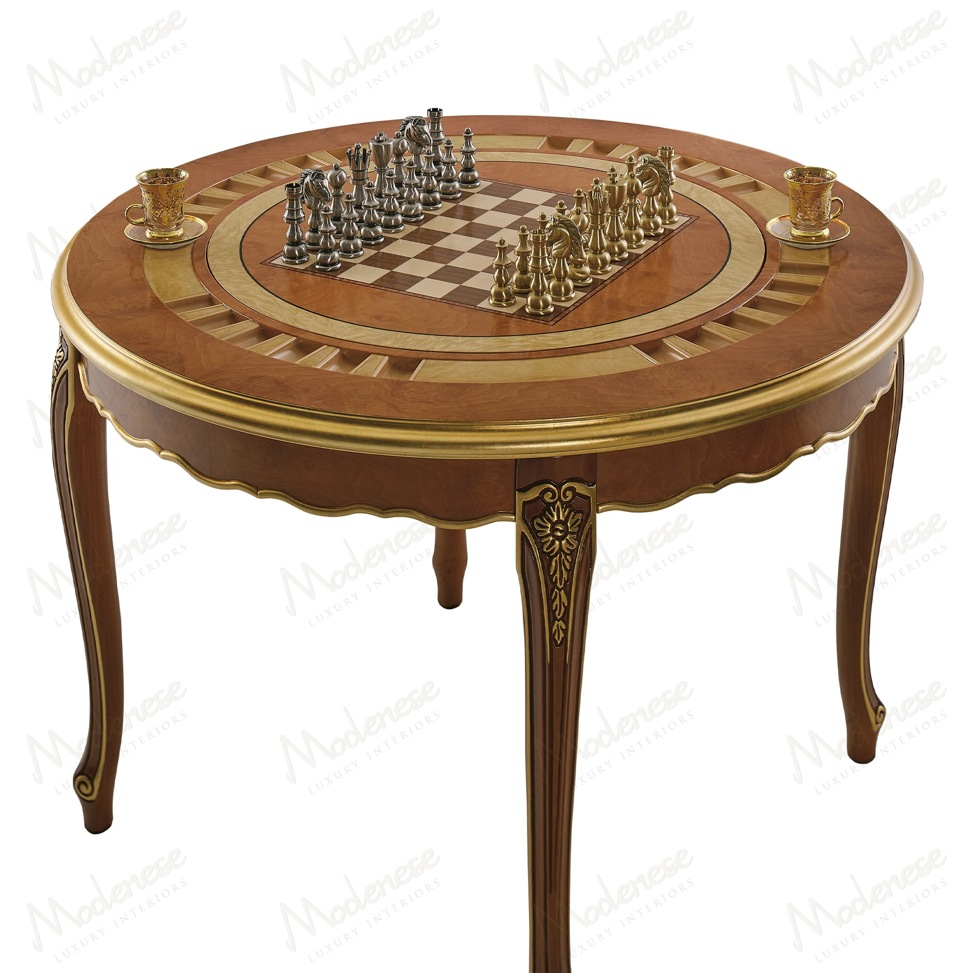 The Royal Blend Gaming Table is the ultimate fusion of sophistication and entertainment. Expertly crafted from the finest wood and adorned with elegant gold detailing, this round table boasts a built-in chessboard at its center, making it a refined choice for game lovers and connoisseurs of luxury. The warm walnut tones and hand-carved embellishments showcase timeless craftsmanship, while its sturdy legs ensure durability and stability. Whether used for strategic chess matches or as a stylish centerpiece in a luxury living space, this table elevates any room with its regal charm.