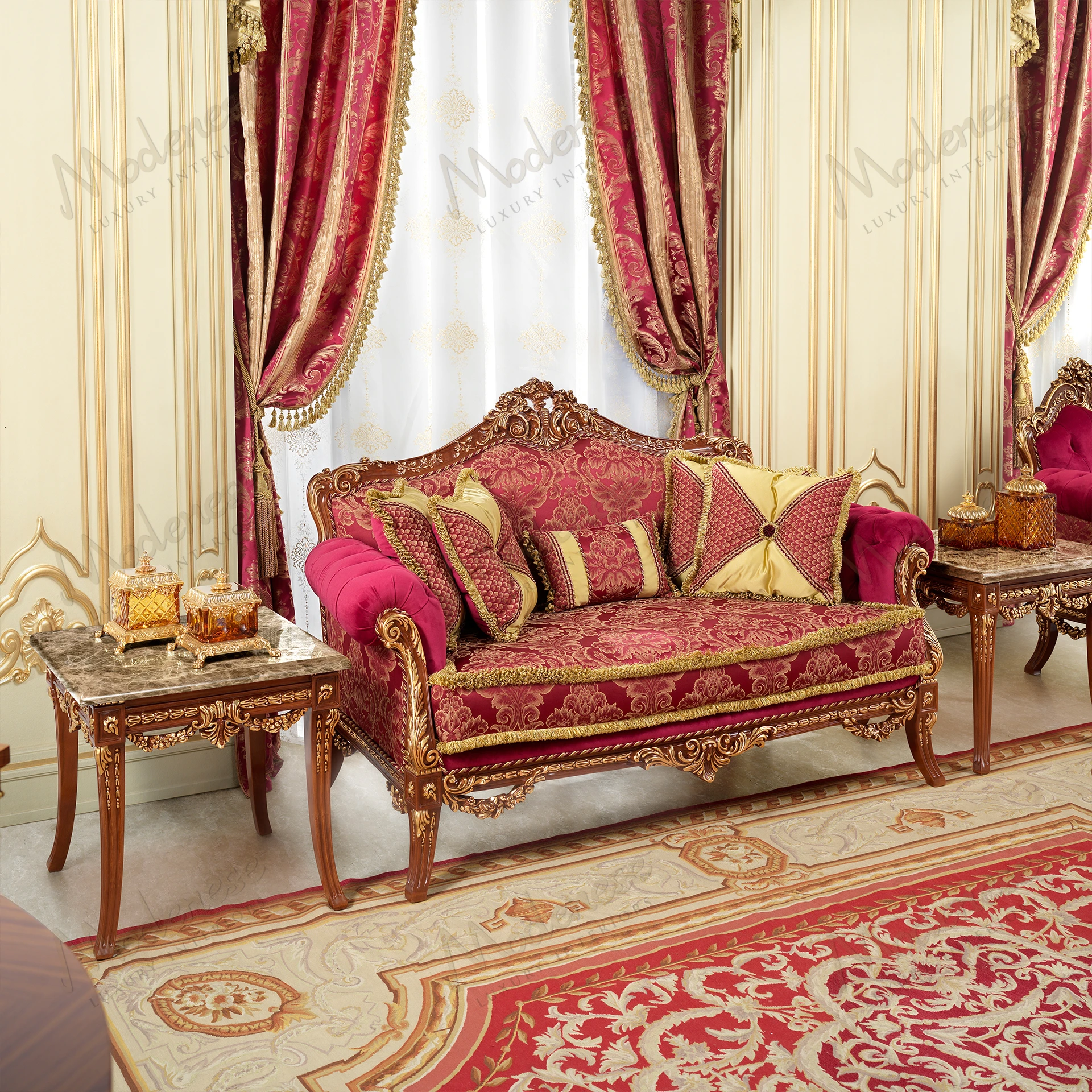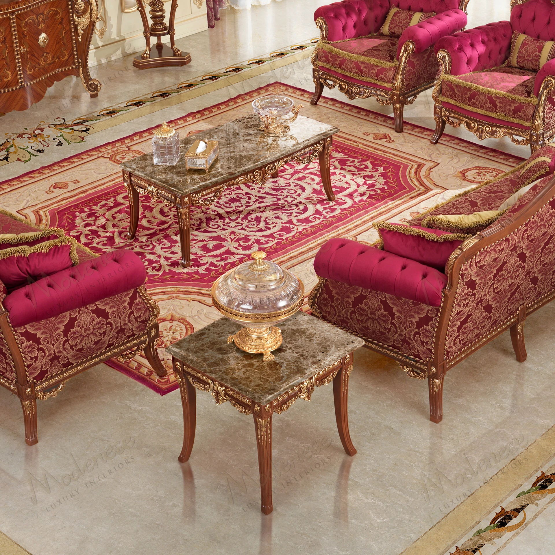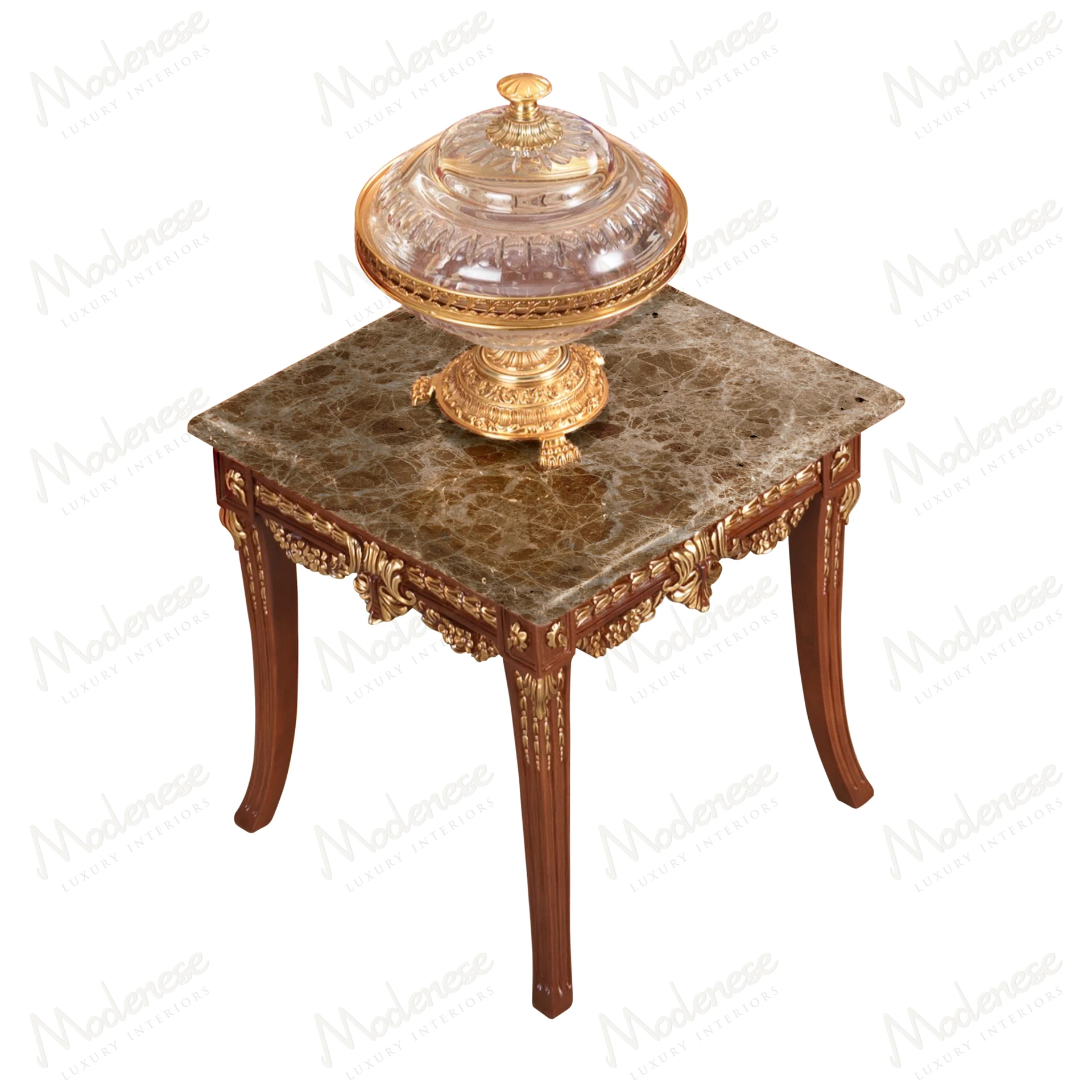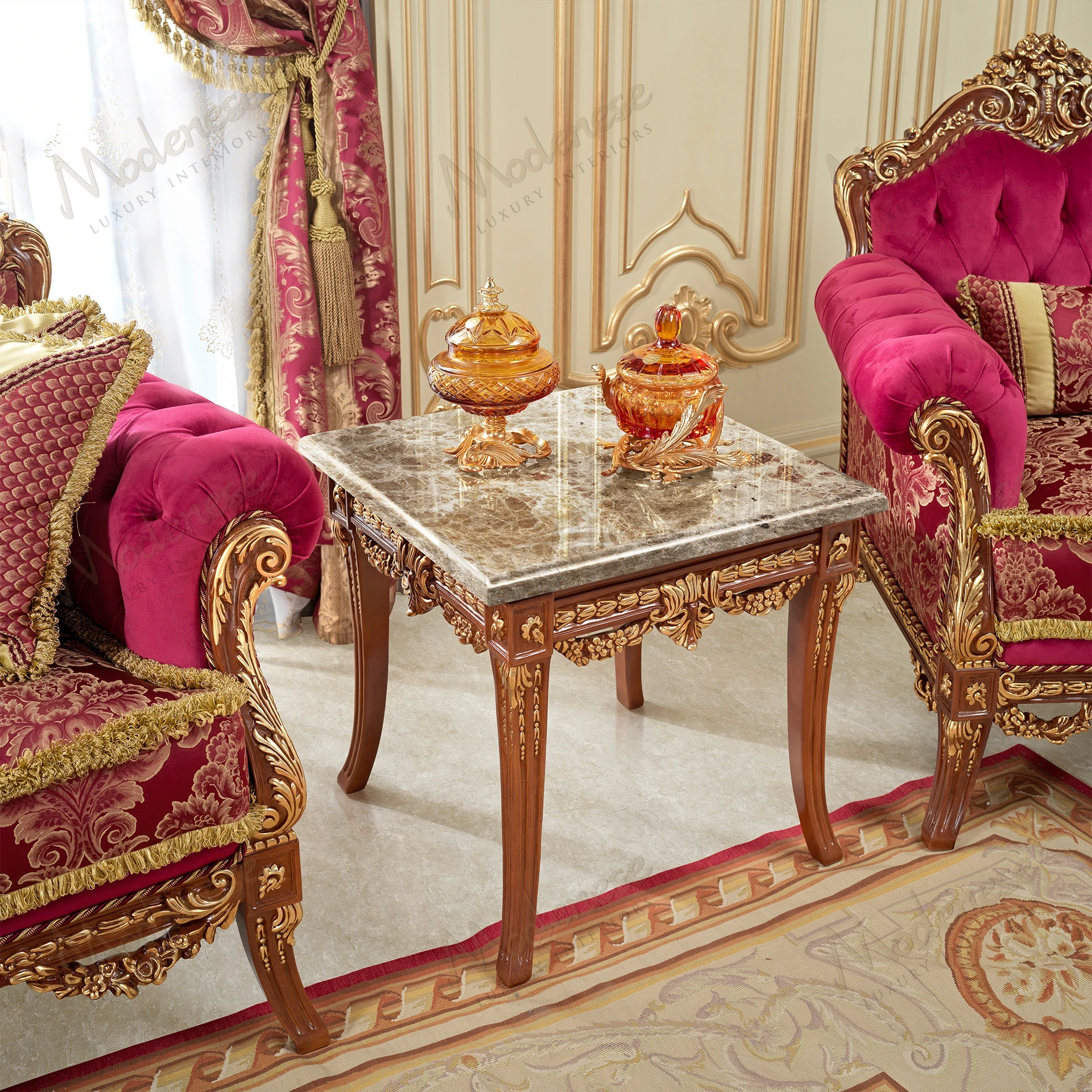 • Rubino Delight Side Table: Classic walnut finish, gold leaf details, no fabric Luxurious feel, elegant design Ideal for sophisticated interiors