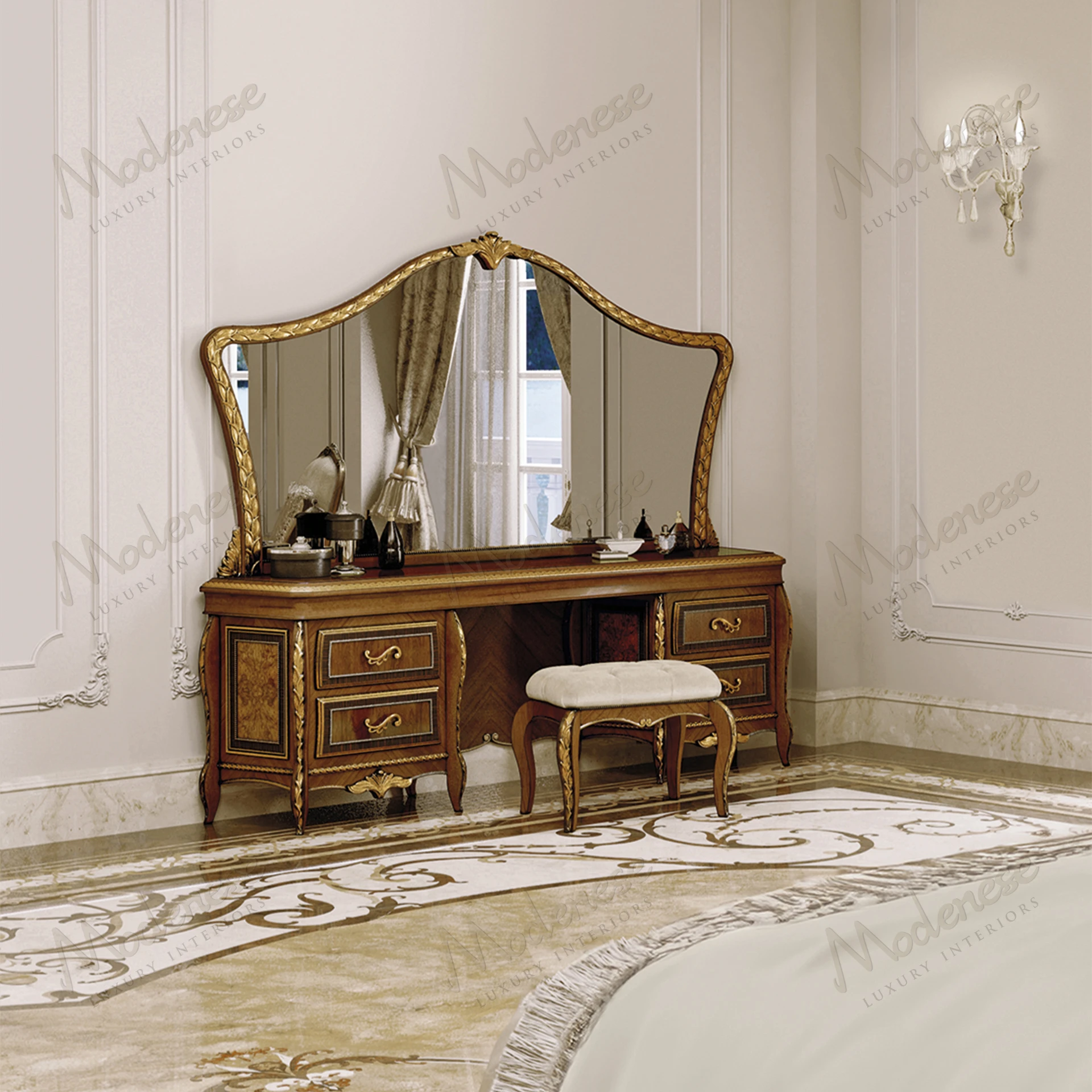 花梨木饰面,3D镶嵌、青铜雕刻、金箔装饰、Rosa Norvegia大理石台面