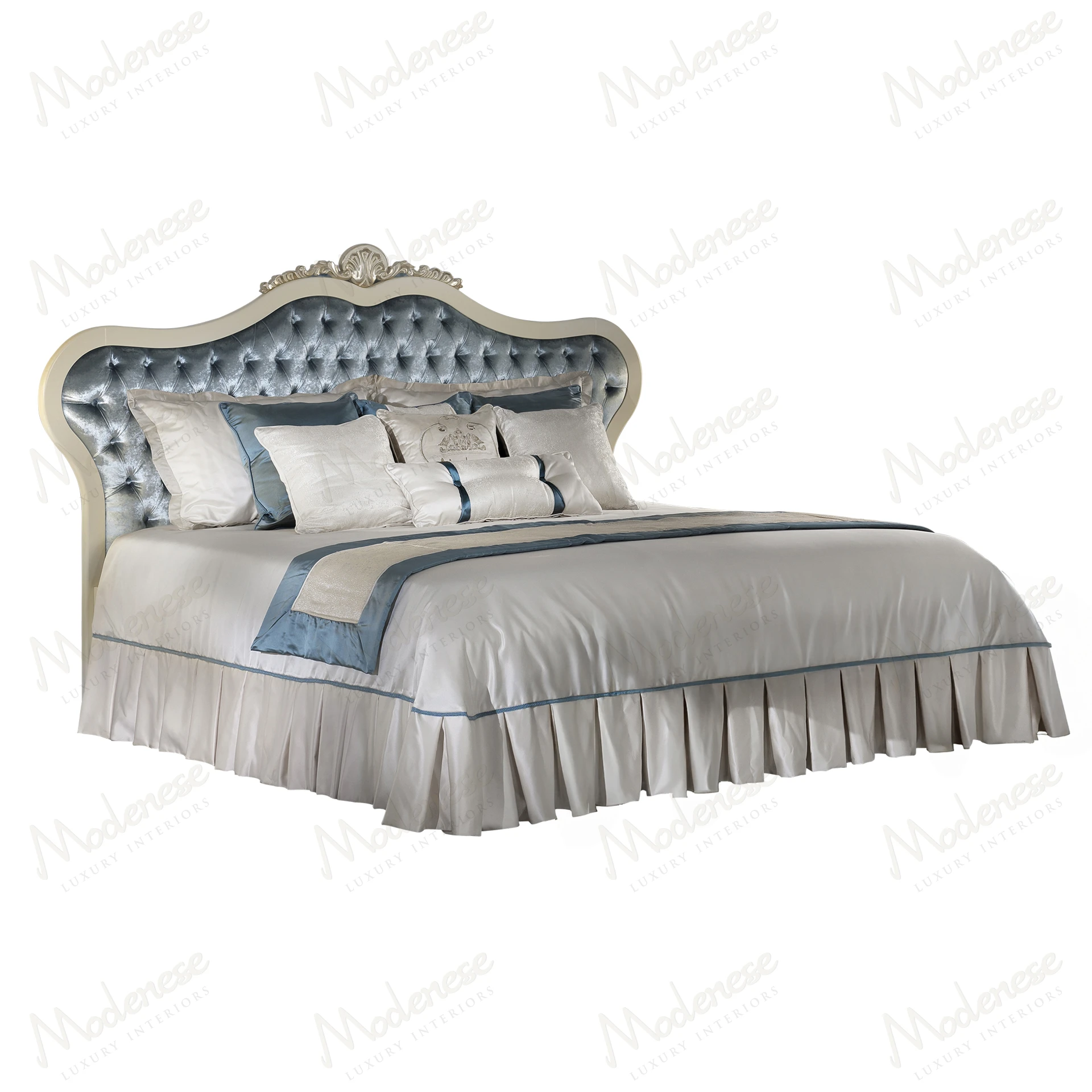 床顶篷:浅色纯色窗帘面料,床身:蓝色缎面面料配同色纽扣